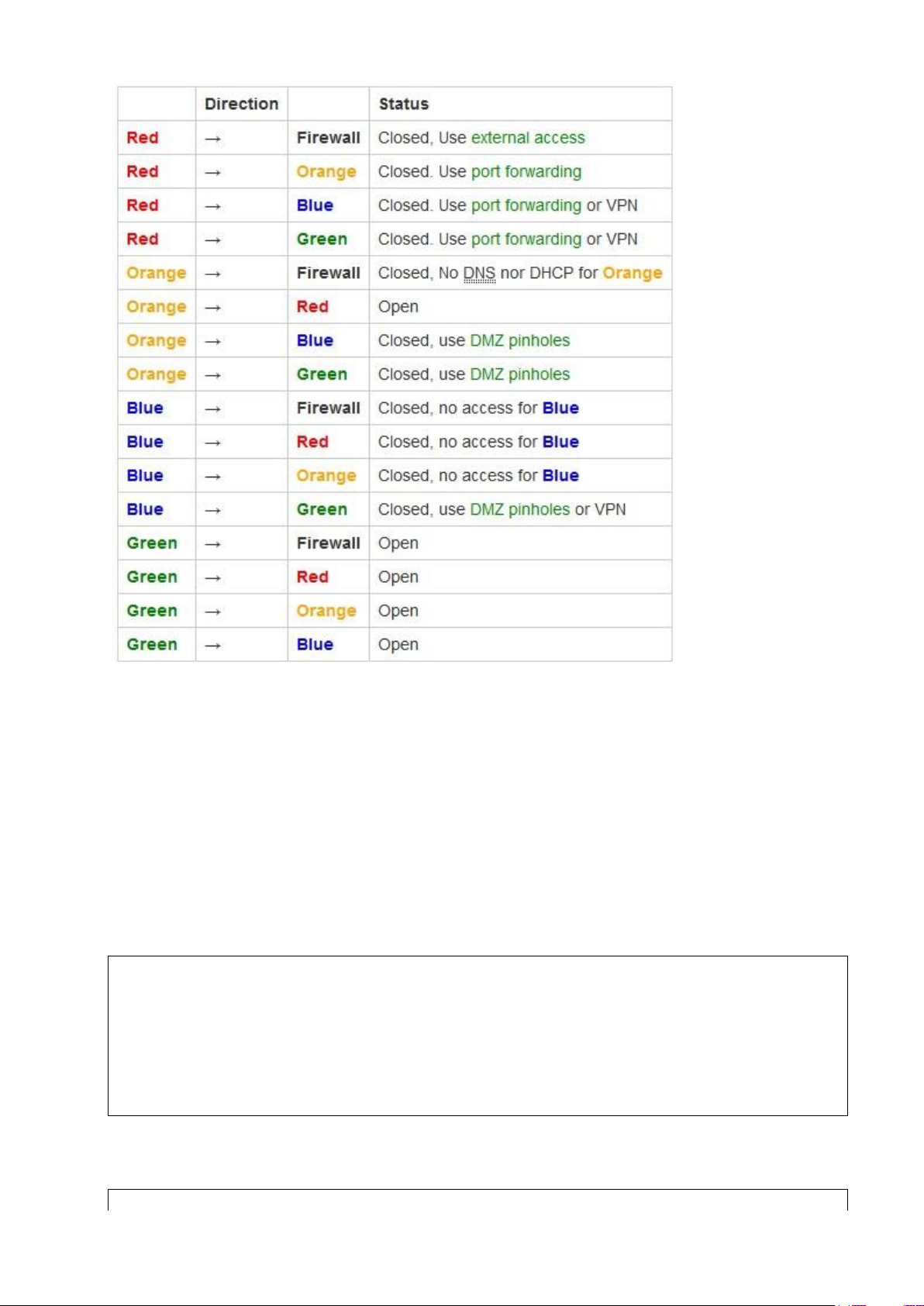 Mặc định, IPFire thiết lập các qui tắc cho phép/cấm kết nối giữa các mạng như sau: lOMoAR cPSD| 61601435