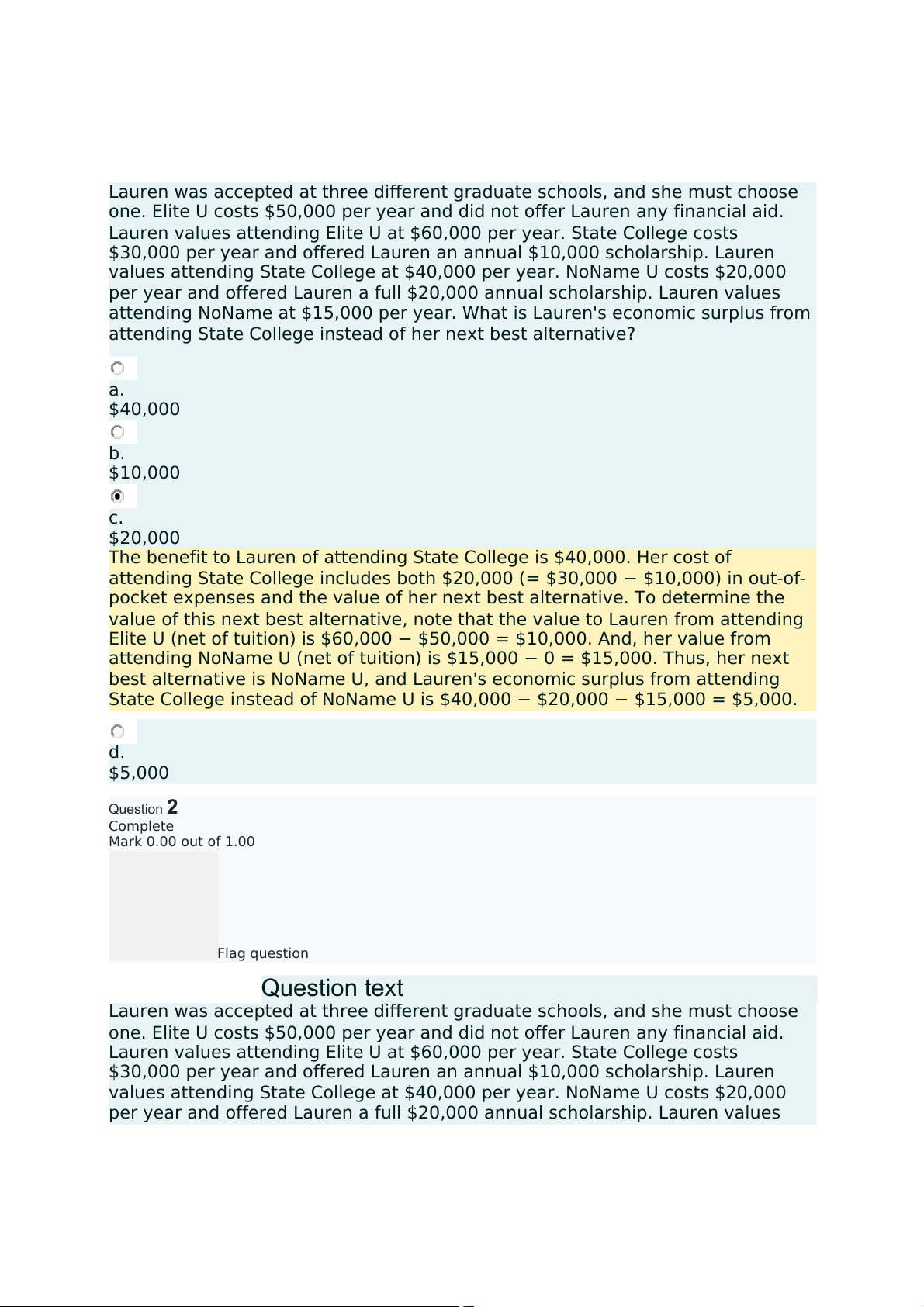 State College instead of NoName U is $40,000 − $20,000 − $15,000 = $5,000. d. $5,000 Question2 Complete Mark 0.00 out of 1.00 Flag question Questiontext