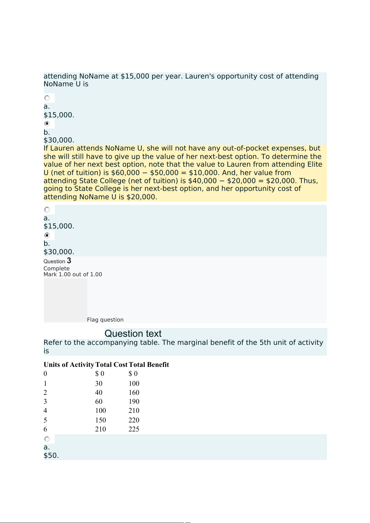 going to State College is her next-best option, and her opportunity cost of attending NoName U is $20,000. a. $15,000. b. $30,000. Question3 Complete Mark 1.00 out of 1.00 Flag question Questiontext