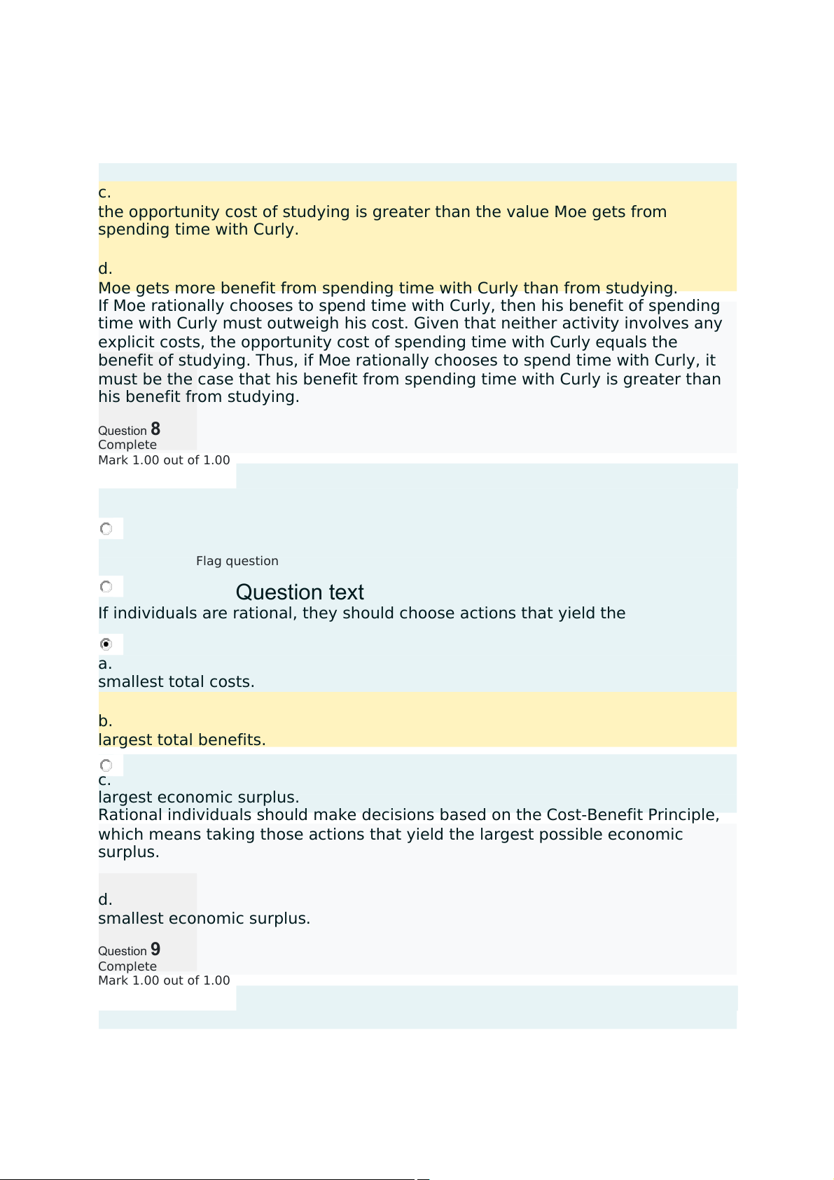 must be the case that his benefit from spending time with Curly is greater than his benefit from studying. Question8 Complete Mark 1.00 out of 1.00 Flag question Questiontext