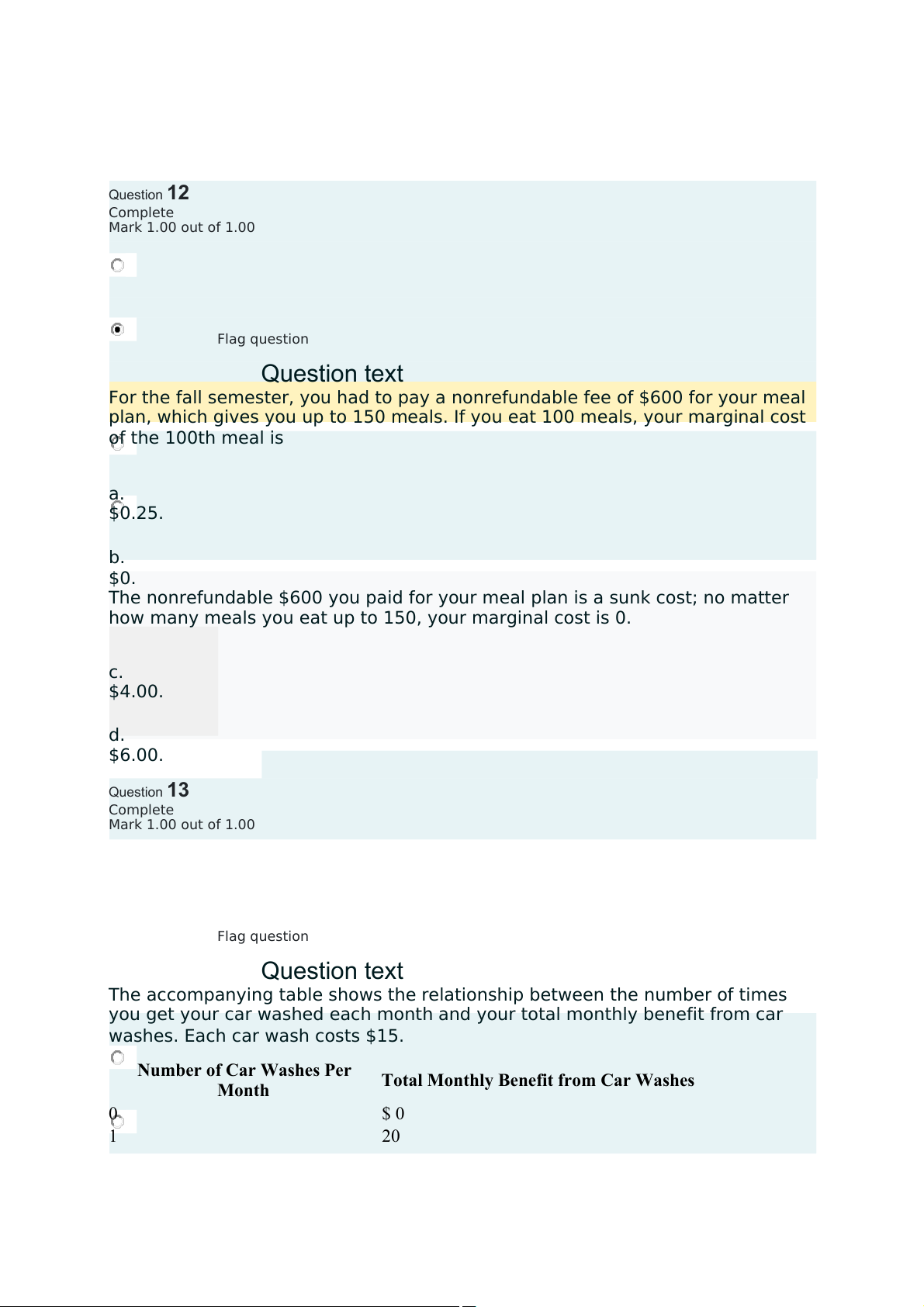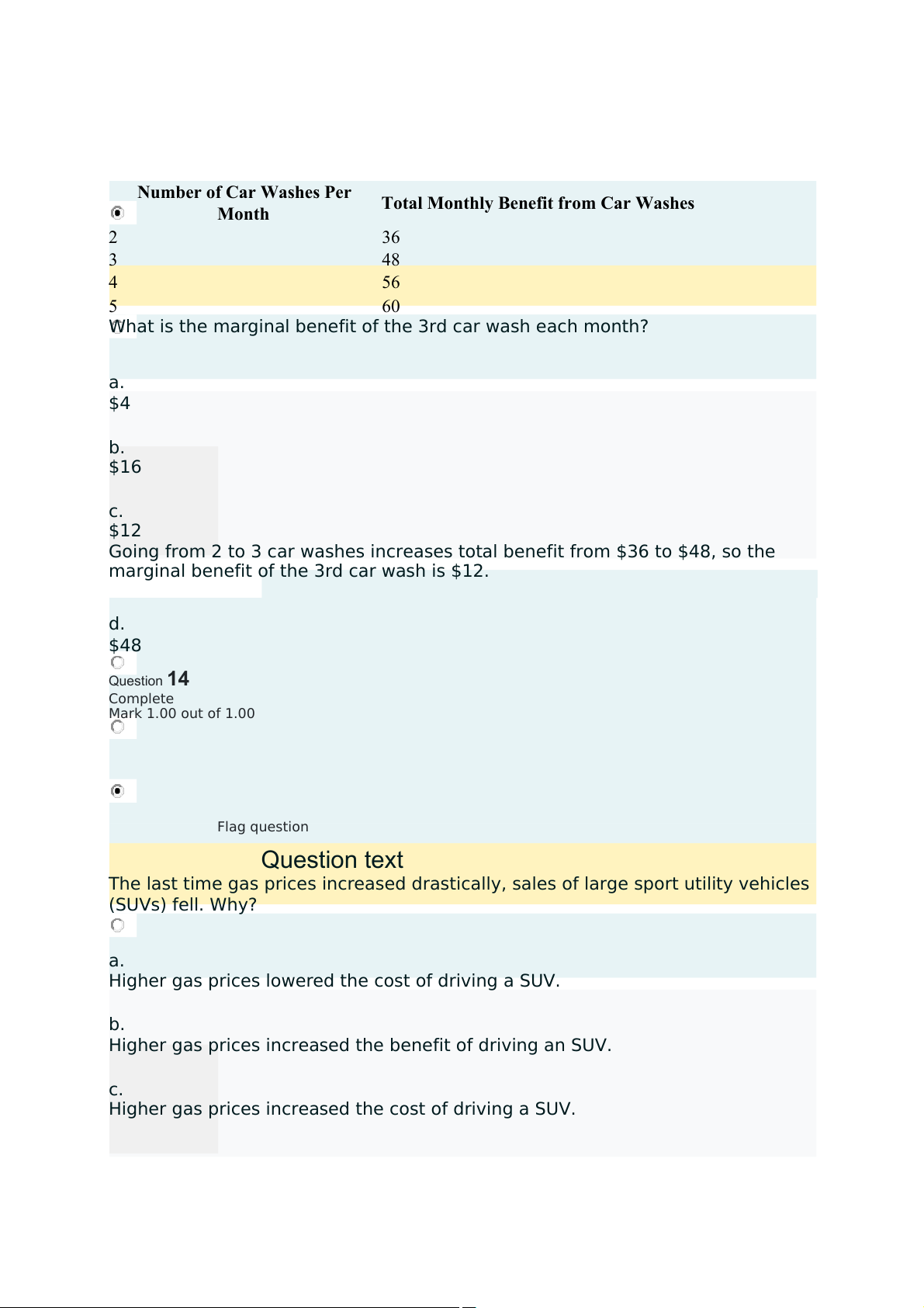 marginal benefit of the 3rd car wash is $12. d. $48 Question14 Complete Mark 1.00 out of 1.00 Flag question Questiontext