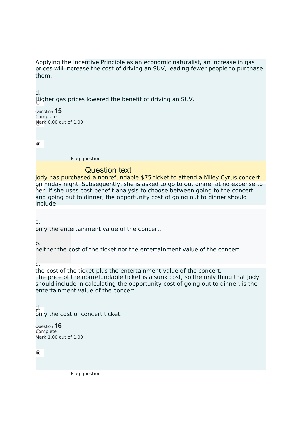 only the cost of concert ticket. Question16 Complete Mark 1.00 out of 1.00 Flag question Questiontext