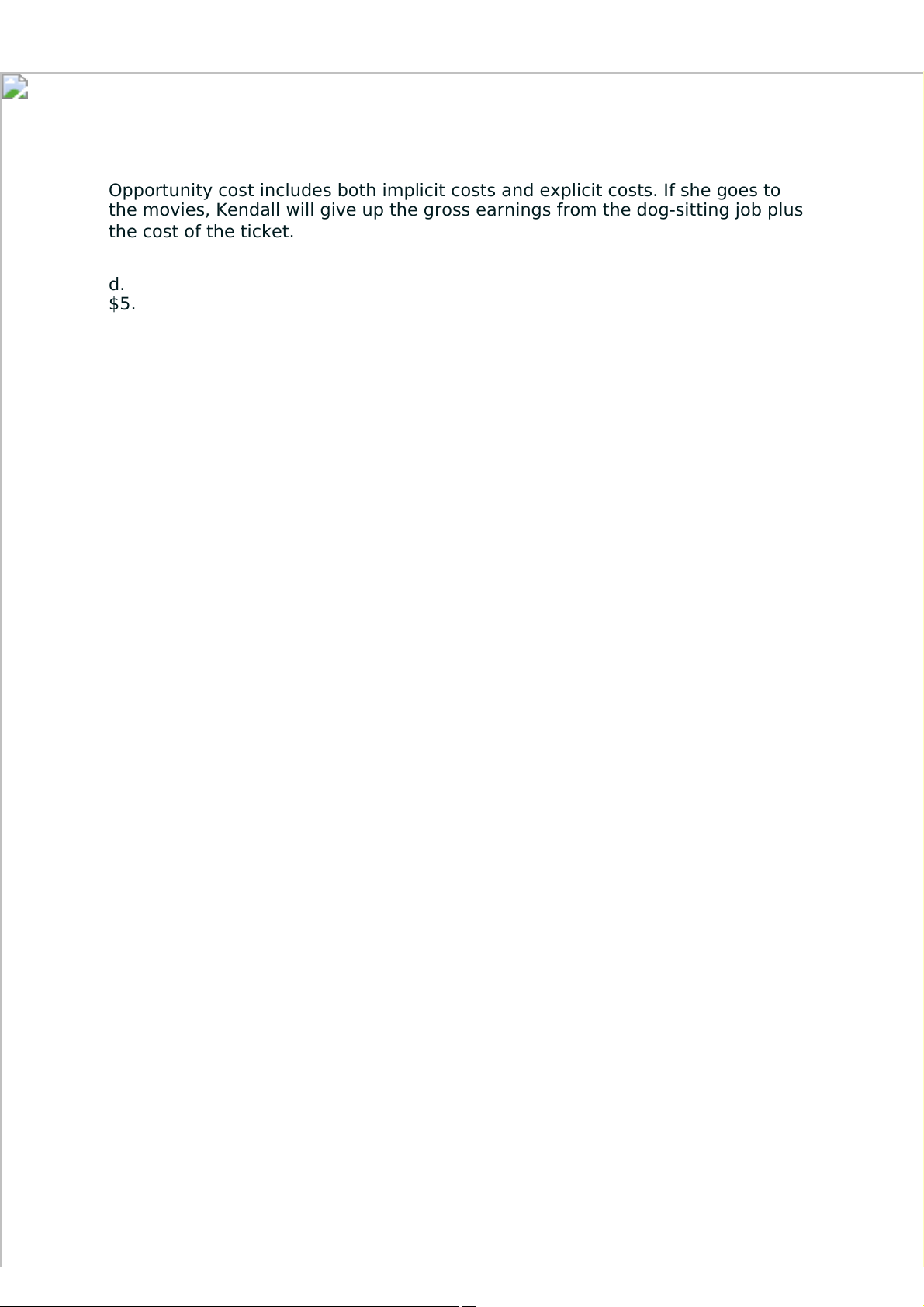to do for free. Kendall’s opportunity cost of going to the movies is a. $15. b. $35. c. $20.