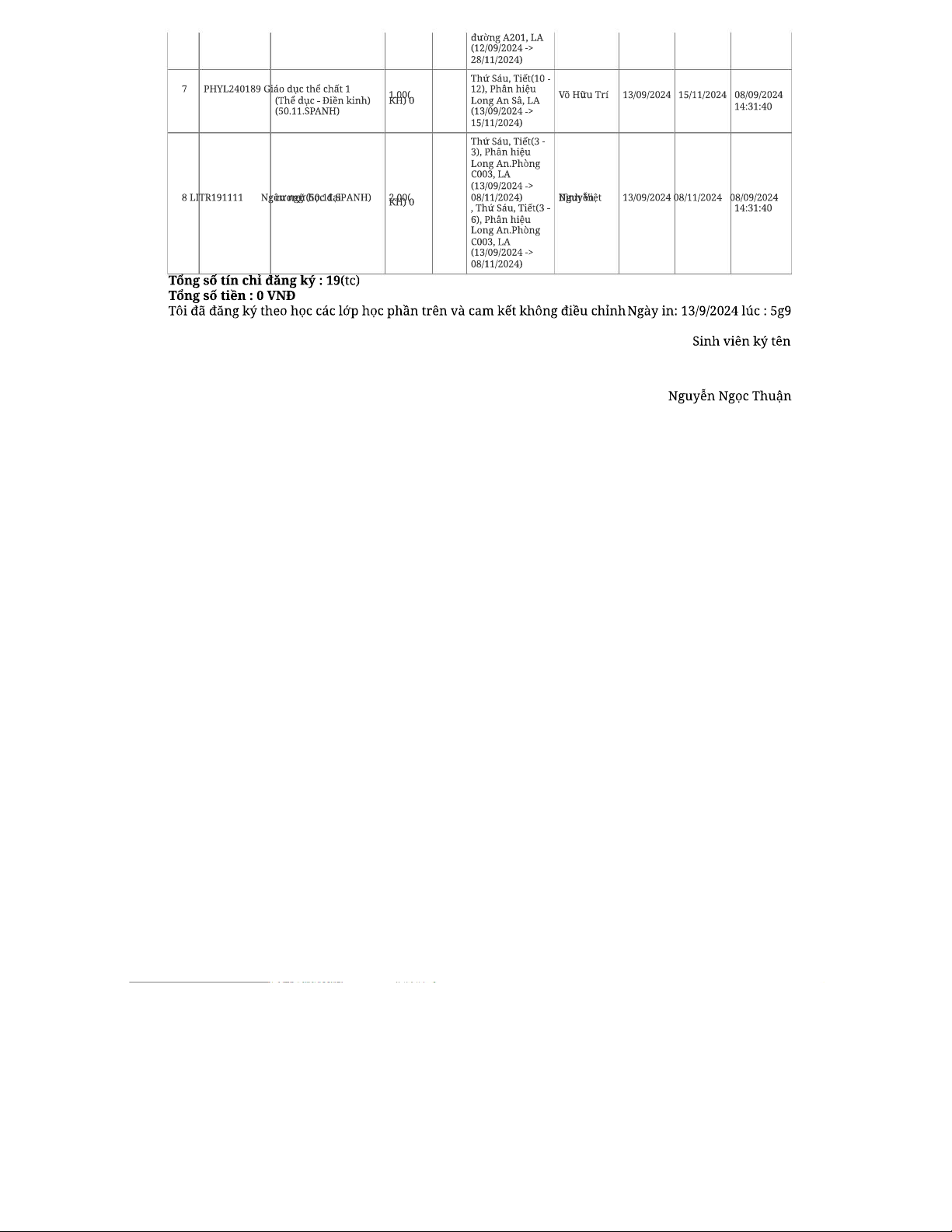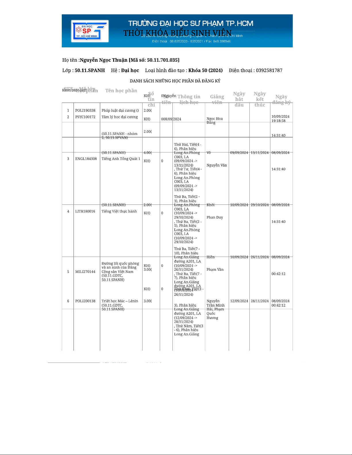 Thời Khóa Biểu Sinh Viên 50.11 Học Kỳ 01 Năm 2024