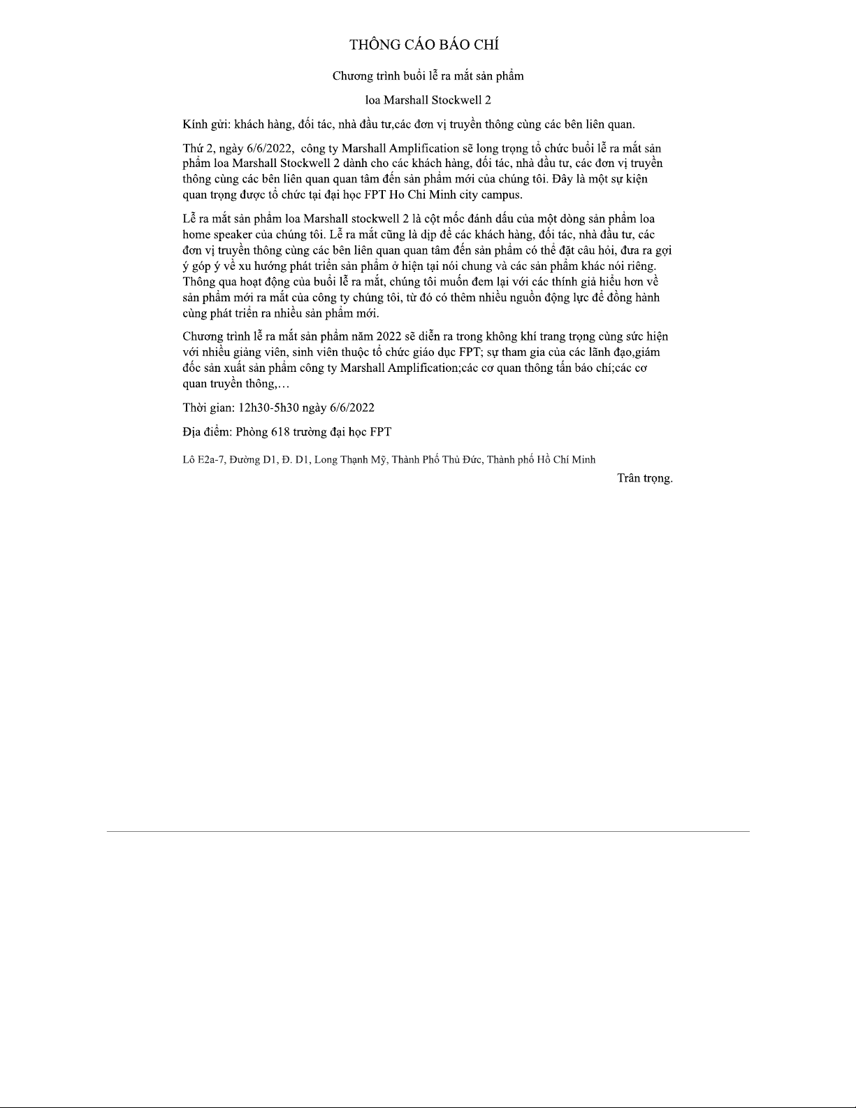 Thông cáo báo chí lễ ra mắt sản phẩm loa Marshall Stockwell 2