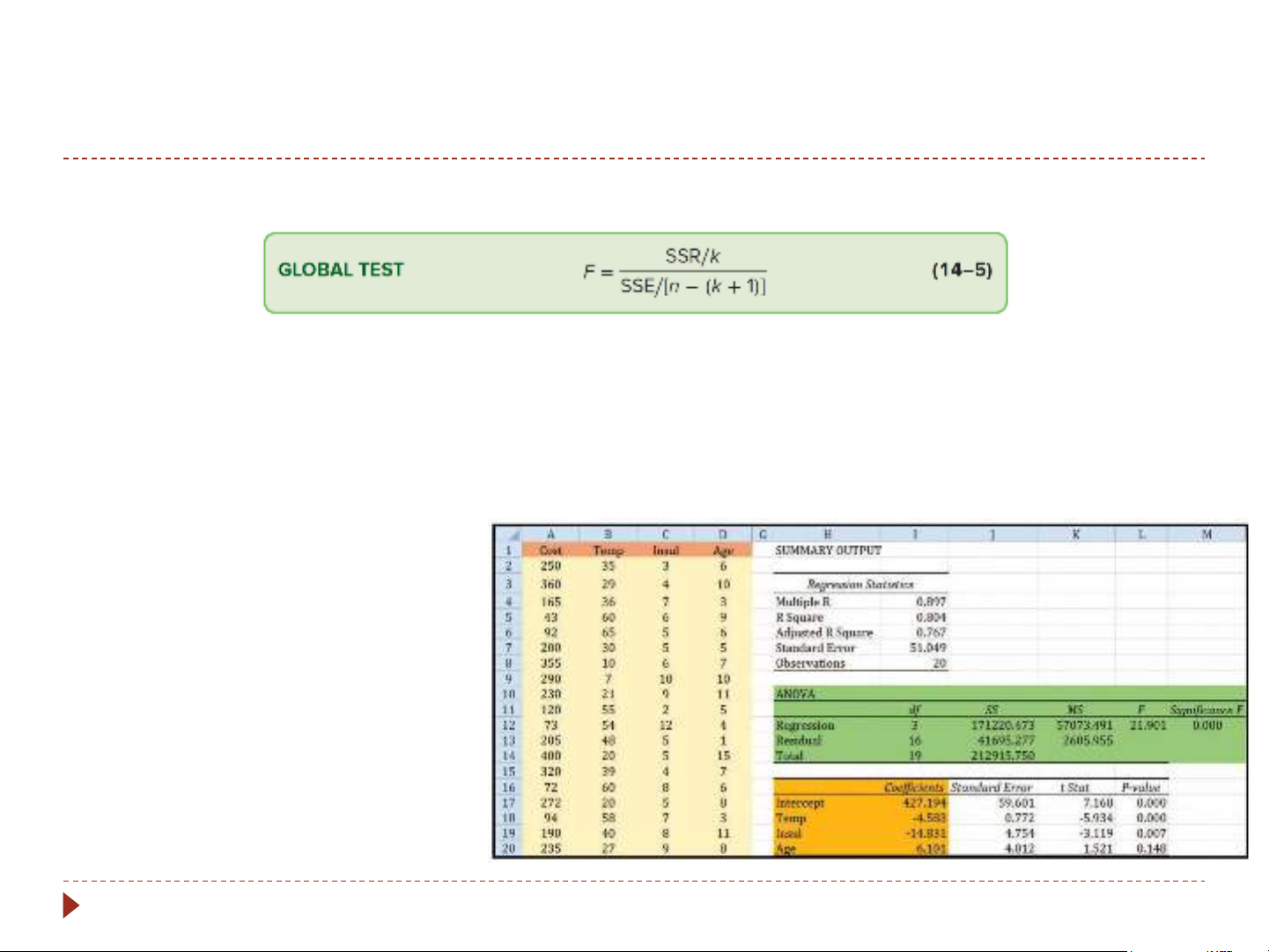 n – (k+1) degrees of freedom in the denominator n is sample size We can obtain the degrees of freedom from the ANOVA table 4-13 Global Test (3 of 4)