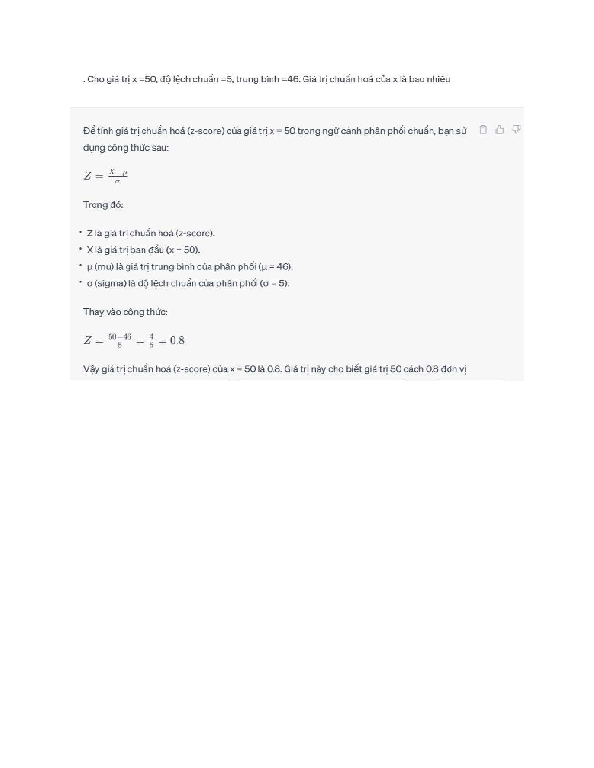5. Cho giá trị x =50, độ lệch chuẩn =5, trung bình =46. Giá trị chuẩn hoá của x là bao nhiêu? a. 1.02 b. 0.8 c. -1.02 d. -0.8
