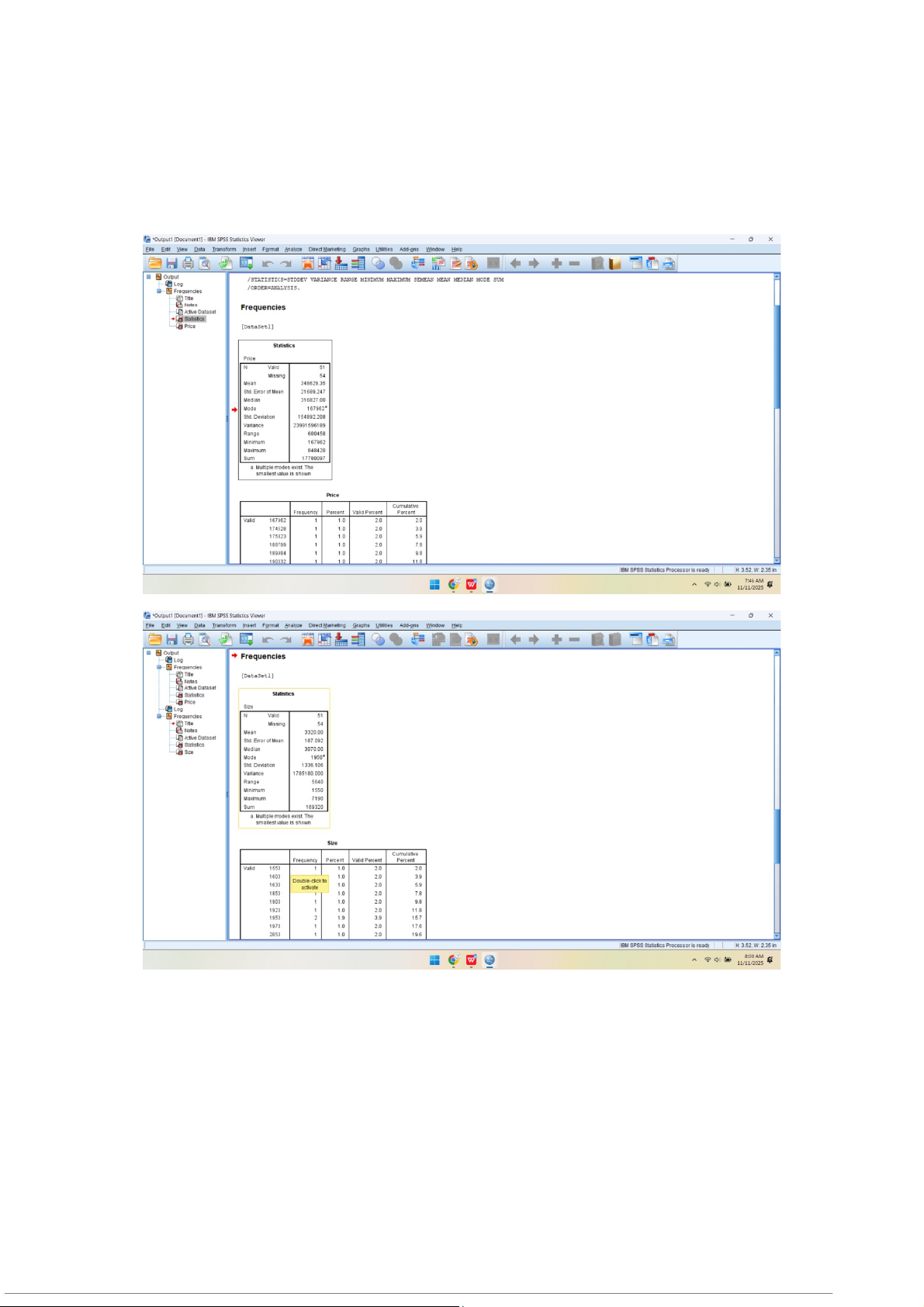 Statistic-> Frequency-> Ấn Statistic-> chọn các chỉ tiêu thống kê-> ấn OK ra được phần dữ liệu trên. Với biến Price: Với biến Size