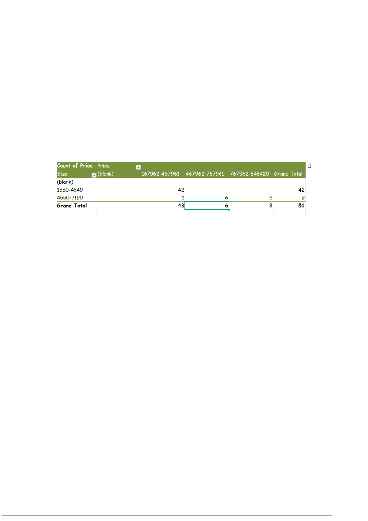 Em thu được bộ dữ liệu với: Price Size Mean ( số trung bình) 348629,35 3320 Median( trung vị) 316827 3070 Mode(mốt) Không có Không có Min(giá trị nhỏ nhất) 167962 1550 Max 848420 7190 Range(khoảng biến thiên) 680458 5640