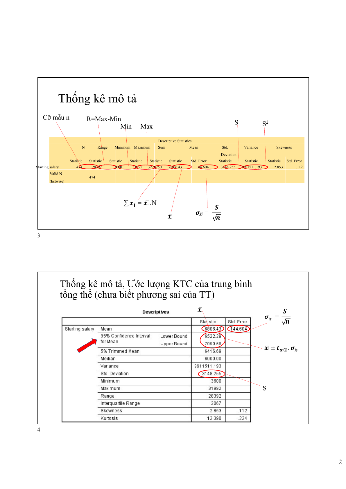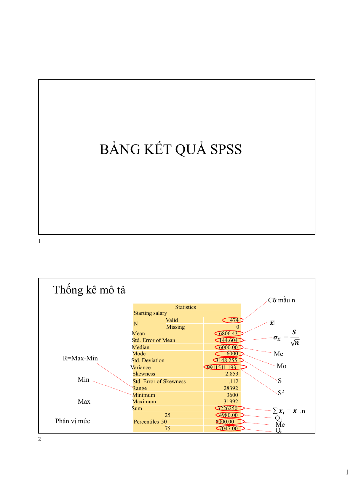 BẢNG KẾT QUẢ SPSS 1 Thống kê mô tả Cỡ mẫu n Statistics Starting salary Valid 474 N 𝒙 Missing 0 Mean 6806.43 𝑺 Std. Error of Mean 144.604 𝝈𝒙 = 𝒏 Median 6000.00 Mode 6000 Me R=Max-Min Std. Deviation 3148.255 Variance 9911511.193 Mo Skewness 2.853 Min Std. Error of Skewness .112 S Range 28392 Minimum 3600 S2 Max Maximum 31992 Sum 3226250 ∑ 𝒙 25 4980.00 𝒊 = 𝒙 .n Phân vị mức Q Percentiles 50 6000.00 1 Me 75 7047.00 Q3 2 1 Thống kê mô tả Cỡ mẫu n R=Max-Min S Min Max S2 Descriptive Statistics N Range Minimum Maximum Sum Mean Std. Variance Skewness Deviation Statistic Statistic Statistic Statistic Statistic Statistic Std. Error Statistic Statistic Statistic Std. Error Starting salary 474 28392 3600 31992 3226250 6806.43 144.604 3148.255 9911511.193 2.853 .112 Valid N 474 (listwise) ∑ 𝒙𝒊 = 𝒙 .N 𝑺 𝝈 𝒙 𝒙 = 𝒏 3