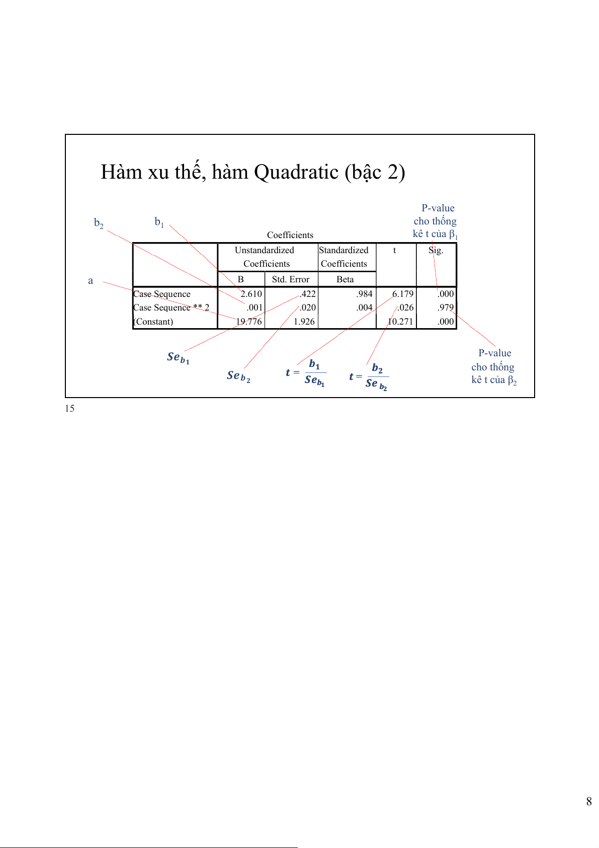 Hàm xu thế, hàm Quadratic (bậc 2) P-value b b cho thống 2 1 Coefficients kê t của β1 Unstandardized Standardized t Sig. Coefficients Coefficients a B Std. Error Beta Case Sequence 2.610 .422 .984 6.179 .000 Case Sequence ** 2 .001 .020 .004 .026 .979 (Constant) 19.776 1.926 10.271 .000 𝑺𝒆 P-value 𝒃𝟏 𝒃𝟏 cho thống 𝒕 = 𝒃 𝑺𝒆 𝟐 𝒃 𝒕 = 𝟐 𝑺𝒆 𝑺 𝒃 𝒆 kê t của β 𝟏 𝒃 𝑺𝒆 𝑺 2 𝒃𝟐 𝒃 15 8