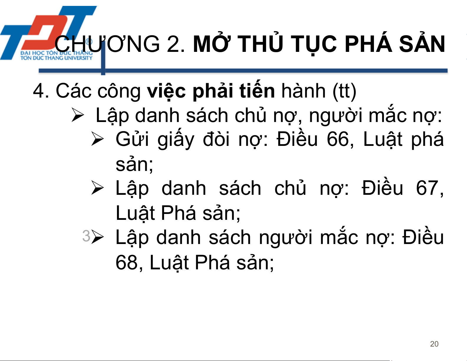 3➢ Lập danh sách người mắc nợ: Điều 68, Luật Phá sản; 20