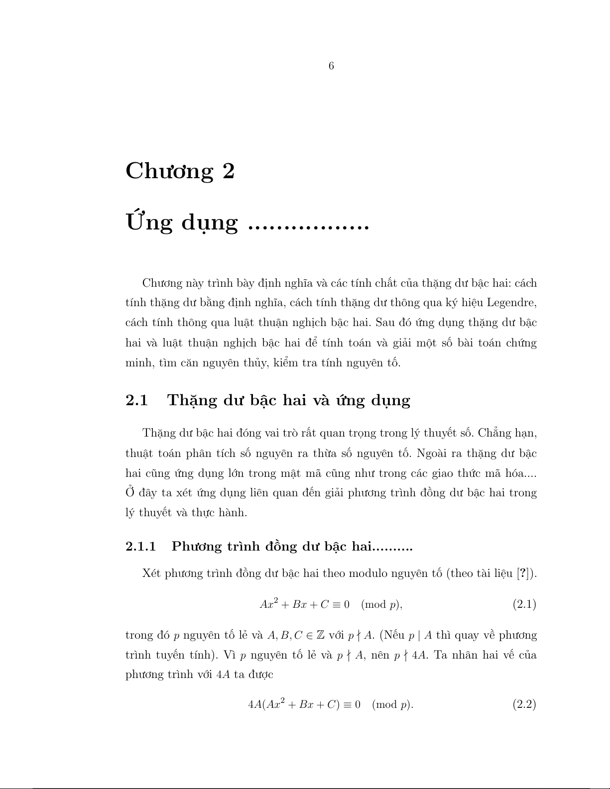 Chương này trình bày định nghĩa và các tính chất của thặng dư bậc hai: cách