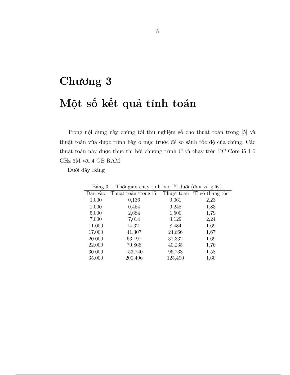 Đầu vào Thuật toán trong [5] Thuật toán Tỉ số thăng tốc 1.000 0,136 0,061 2,23 2.000 0,454 0,248 1,83 5.000 2,684 1,500 1,79 7.000 7,014 3,129 2,24 11.000 14,321 8,484 1,69 17.000 41,307 24,666 1,67 20.000 63,197 37,332 1,69 22.000 70,866 40,235 1,76 30.000 153,240 96,738 1,58 35.000 200,496 125,490 1,60 9 Kết luận