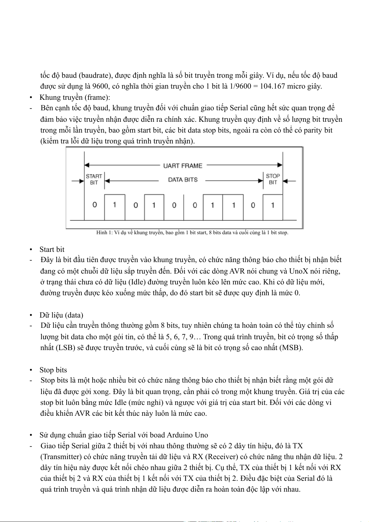 Hình 1: Ví dụ về khung truyền, bao gồm 1 bit start, 8 bits data và cuối cùng là 1 bit stop. • Start bit