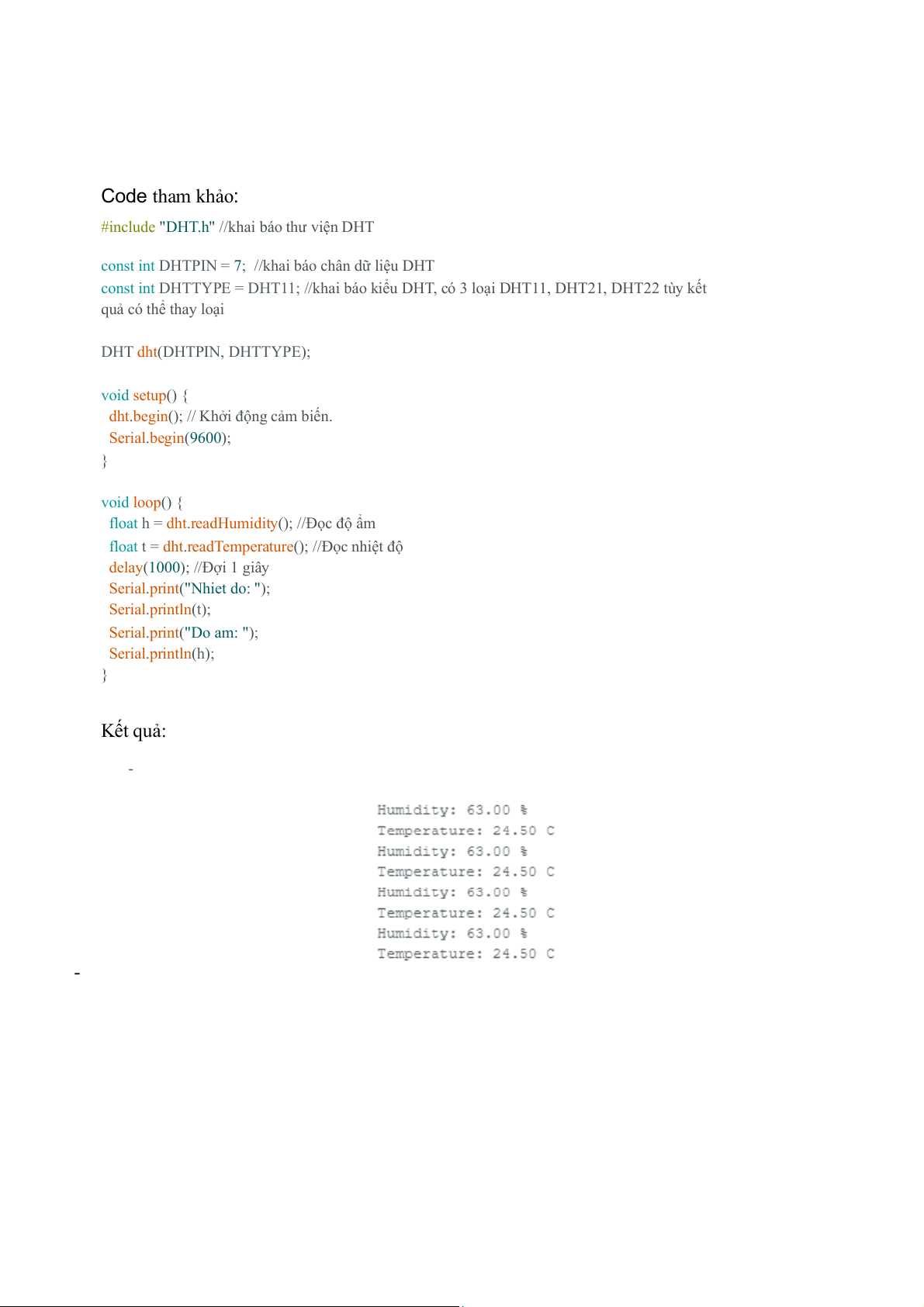 delay(1000); //Đợi 1 giây Serial.print("Nhiet do: "); Serial.println(t); Serial.print("Do am: "); Serial.println(h); } Kết quả: - -