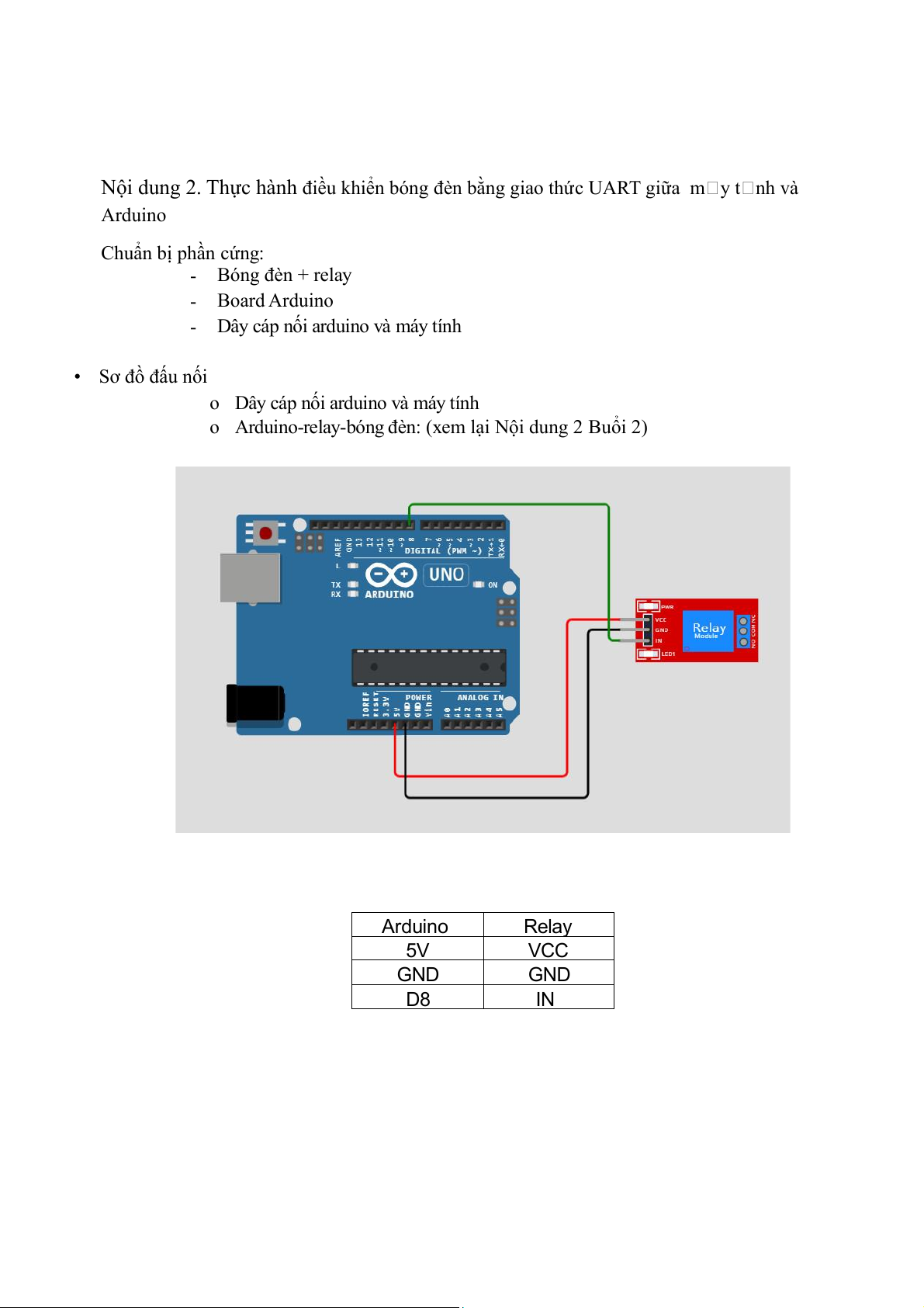 Nội dung 2. Thực hành điều khiển bóng đèn bằng giao thức UART giữa m y t nh và Arduino Chuẩn bị phần cứng: - Bóng đèn + relay - Board Arduino