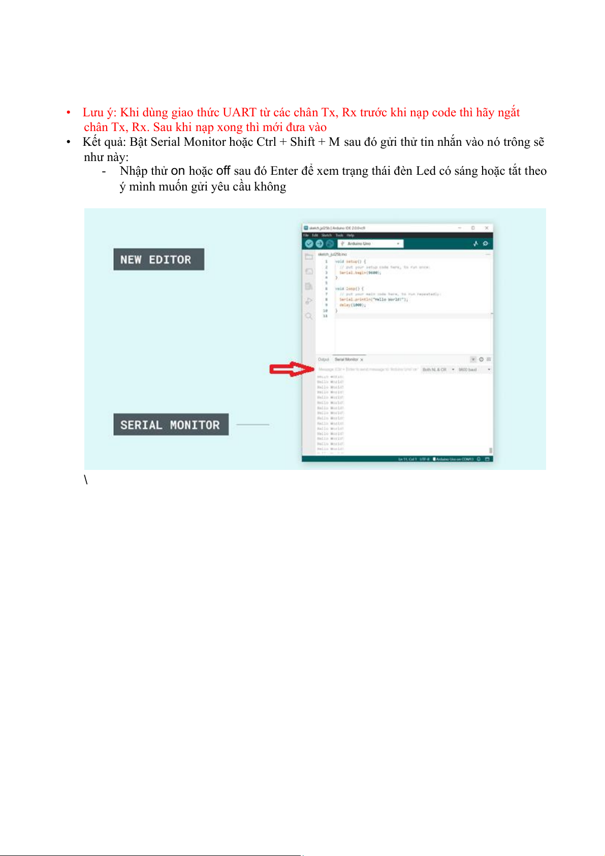 • Kết quả: Bật Serial Monitor hoặc Ctrl + Shift + M sau đó gửi thử tin nhắn vào nó trông sẽ như này: