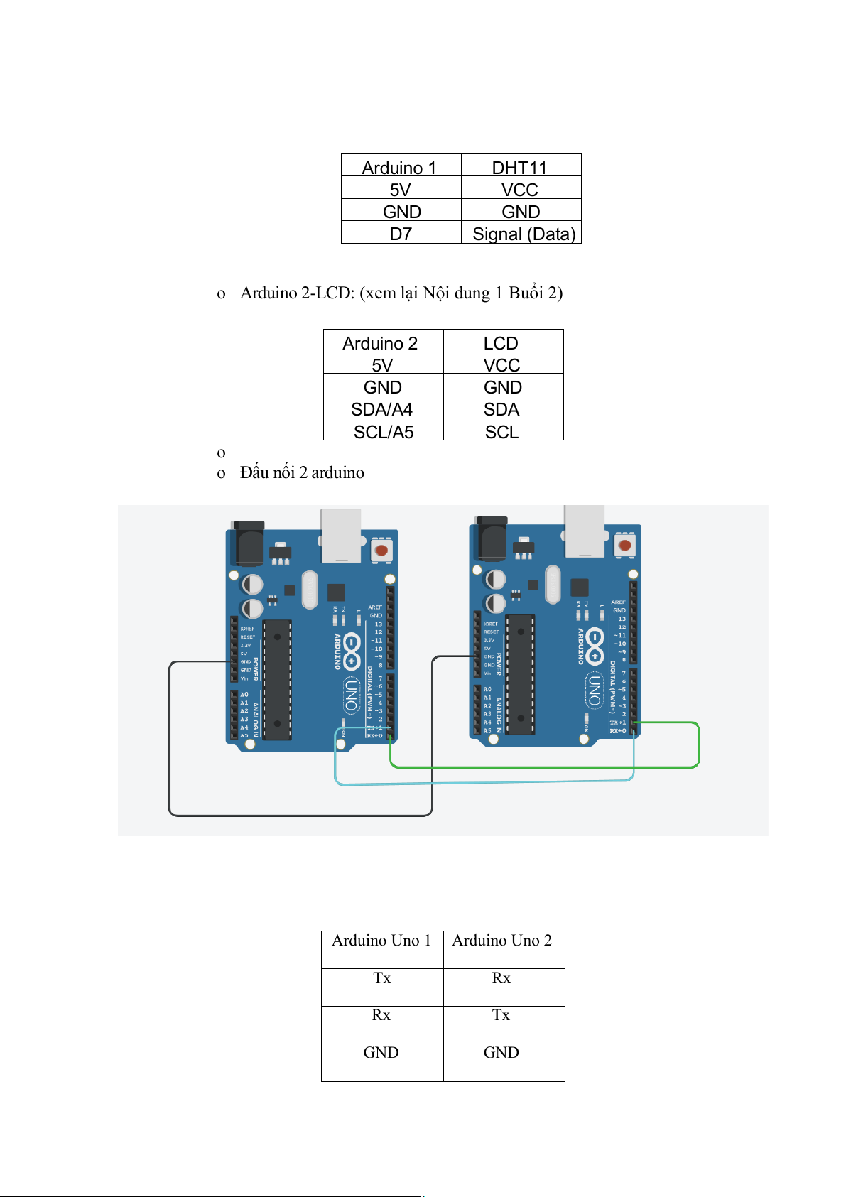 o Arduino 2-LCD: (xem lại Nội dung 1 Buổi 2) Arduino 2 LCD 5V VCC GND GND SDA/A 4 SDA SCL/A 5 SCL o o Đấu nối 2 arduino Arduino Uno 1 Arduino Uno 2 Tx Rx Rx Tx GND GND Code Truyền ữ D liệu: #include #include