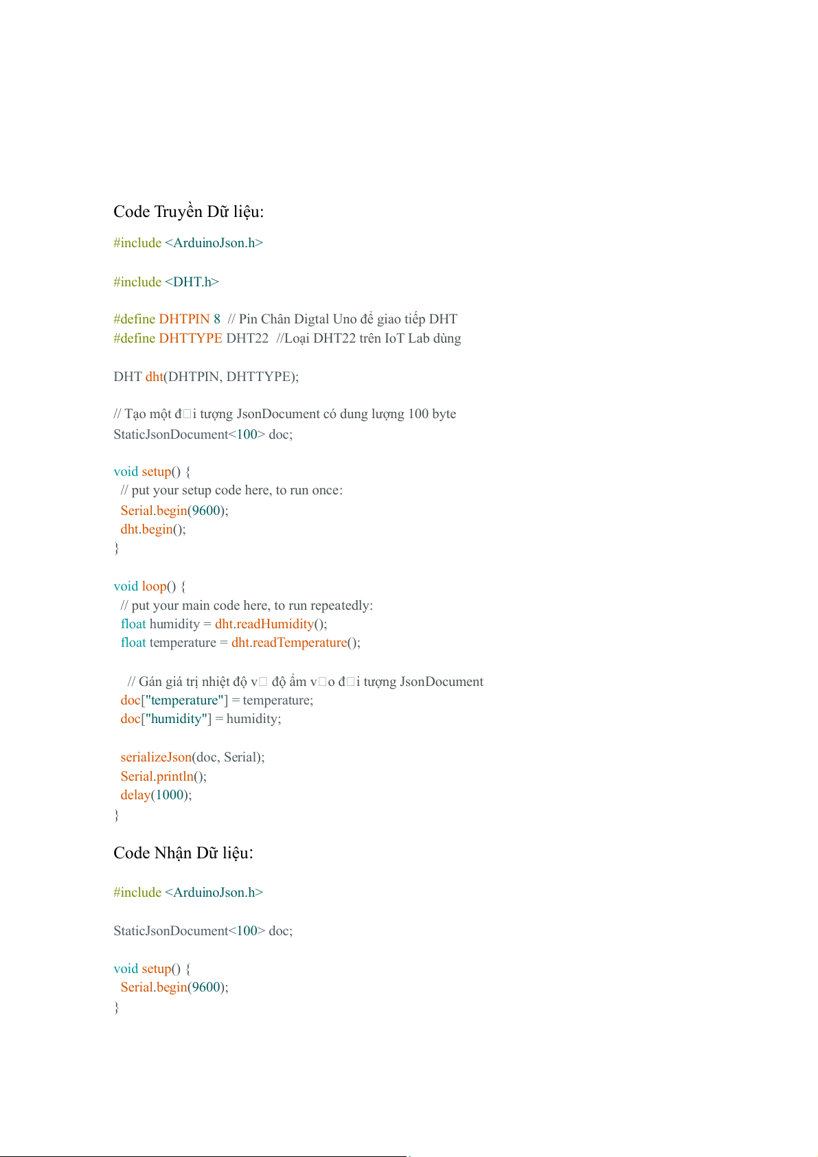 doc["temperature"] = temperature; doc["humidity"] = humidity; serializeJson(doc, Serial); Serial.println(); delay(1000); } Code Nhận Dữ liệu: #include