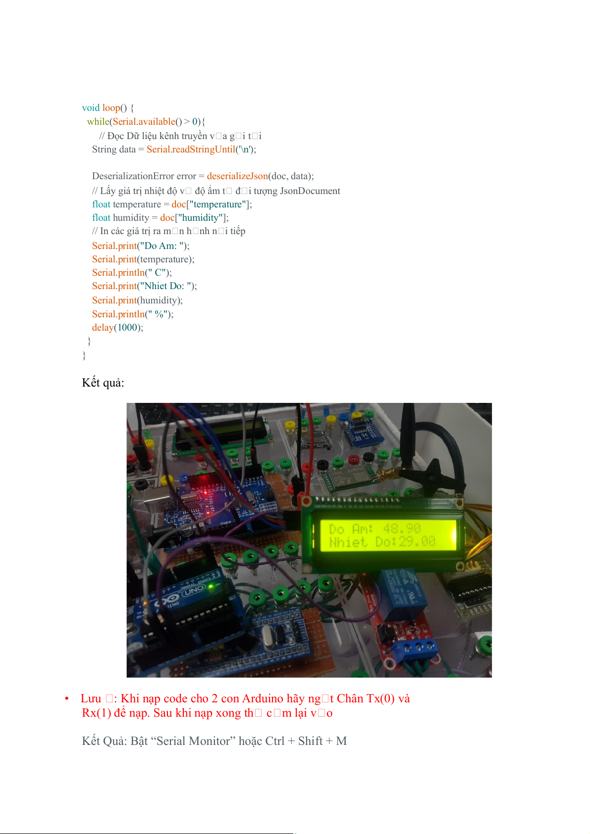 // In các giá trị ra m n h nh n i tiếp Serial.print("Do Am: ) " ; Serial.print(temperature); Serial.println(" C"); Serial.print("Nhiet Do: "); Serial.print(humidity); Serial.println(" %"); delay(1000); } } Kết quả: