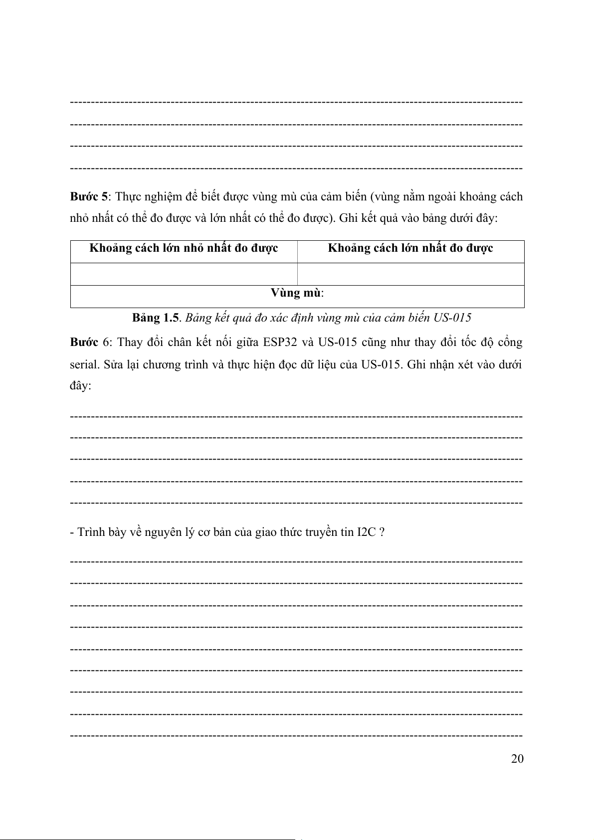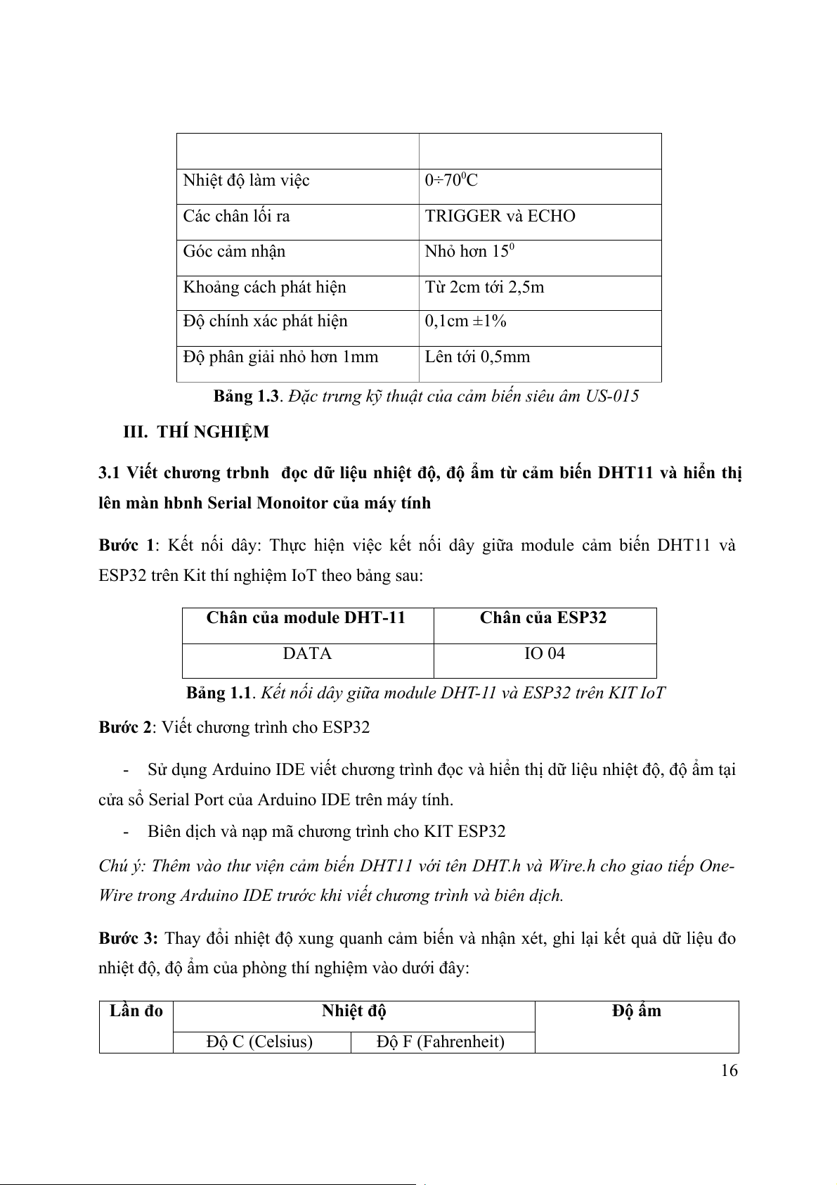 Bảng 1.3. Đặc trưng kỹ thuật của cảm biến siêu âm US-015 III. THÍ NGHIỆM