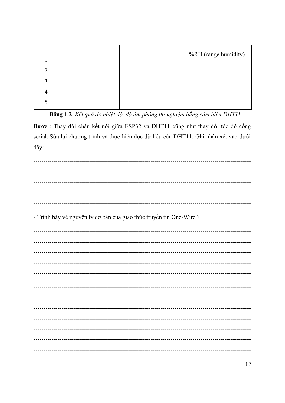 Bảng 1.2. Kết quả đo nhiệt độ, độ ẩm phòng thí nghiệm bằng cảm biến DHT11