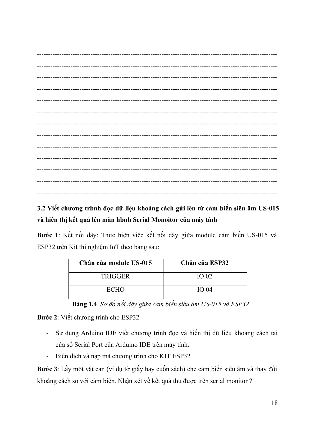 Bảng 1.4. Sơ đồ nối dây giữa cảm biến siêu âm US-015 và ESP32