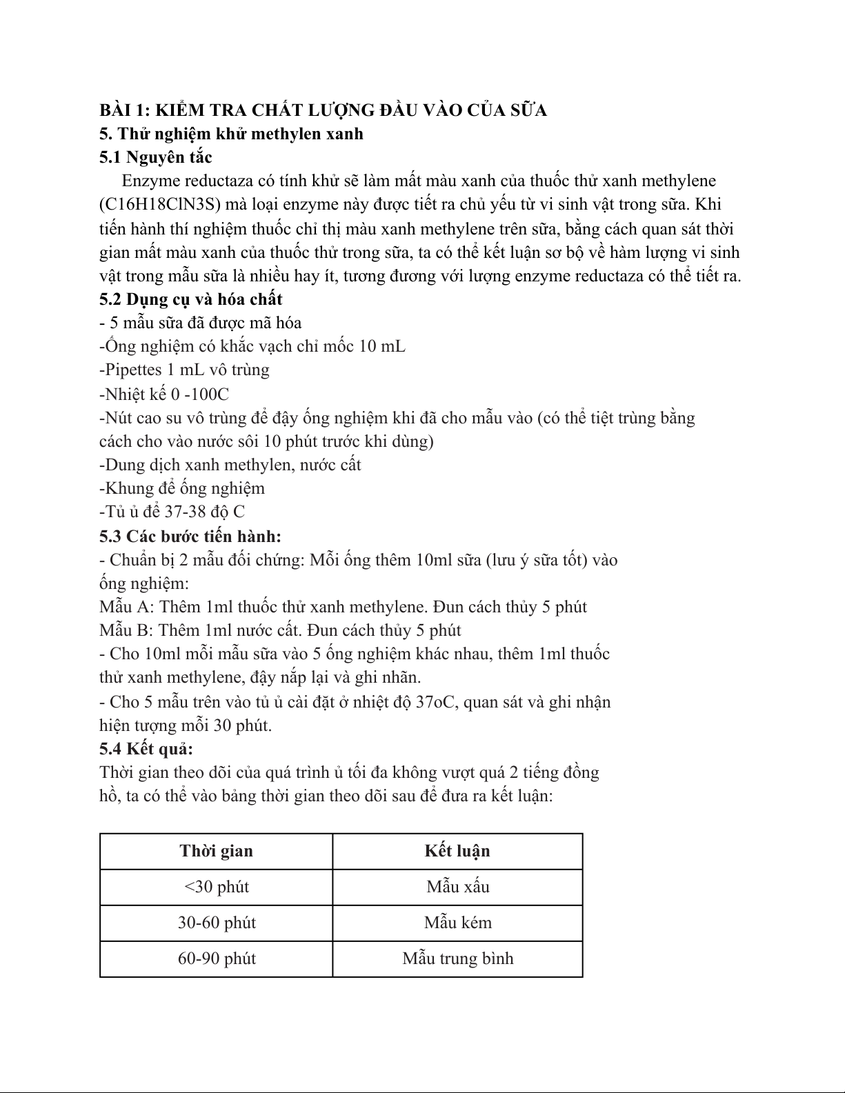 tiến hành thí nghiệm thuốc chỉ thị màu xanh methylene trên sữa, bằng cách quan sát thời