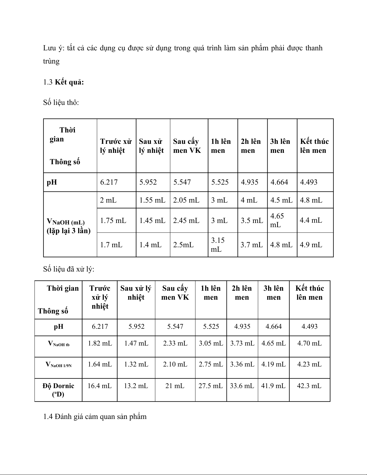 1h lên 2h lên 3h lên Kết thúc lý nhiệt lý nhiệt men VK men men men lên men Thông số pH 6.217 5.952 5.547 5.525 4.935 4.664 4.493 2 mL 1.55 mL 2.05 mL 3 mL 4 mL 4.5 mL 4.8 mL 4.65 VNaOH (mL) 1.75 mL 1.45 mL 2.45 mL 3 mL 3.5 mL 4.4 mL mL (lặp lại 3 lần) 3.15 1.7 mL 1.4 mL 2.5mL 3.7 mL 4.8 mL 4.9 mL mL Số liệu đã xử lý: Thời gian Trước Sau xử lý Sau cấy 1h lên 2h lên 3h lên Kết thúc xử lý nhiệt men VK men men men lên men nhiệt Thông số pH 6.217 5.952 5.547 5.525 4.935 4.664 4.493 VNaOH tb 1.82 mL 1.47 mL 2.33 mL 3.05 mL 3.73 mL 4.65 mL 4.70 mL VNaOH 1/9N 1.64 mL 1.32 mL 2.10 mL 2.75 mL 3.36 mL 4.19 mL 4.23 mL Độ Dornic 16.4 mL 13.2 mL 21 mL 27.5 mL 33.6 mL 41.9 mL 42.3 mL (oD)