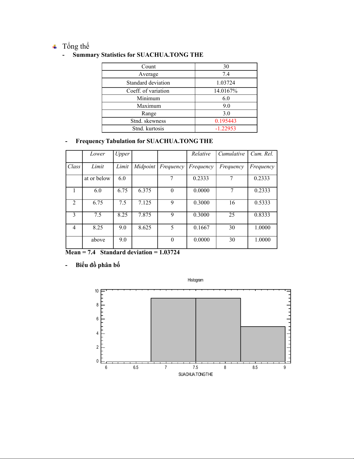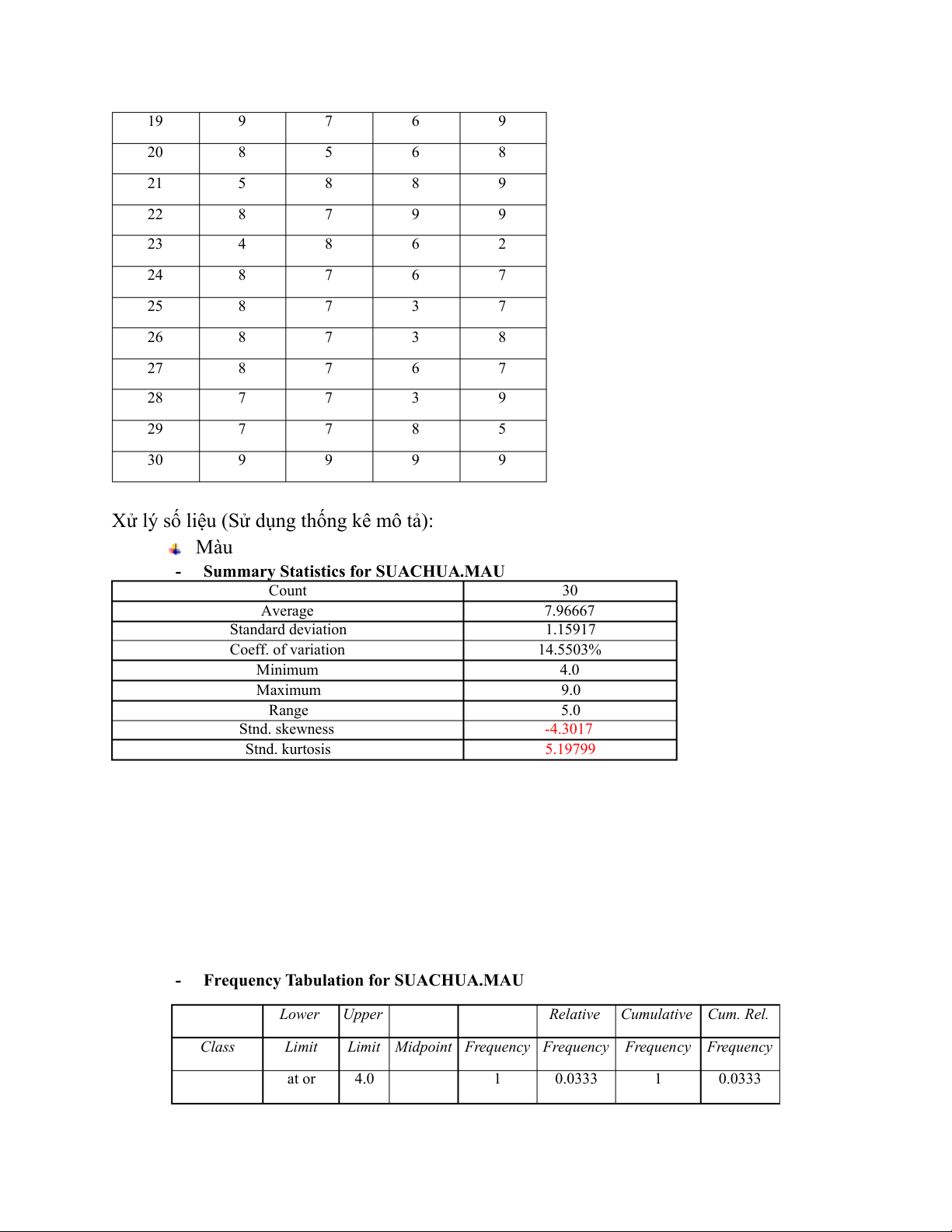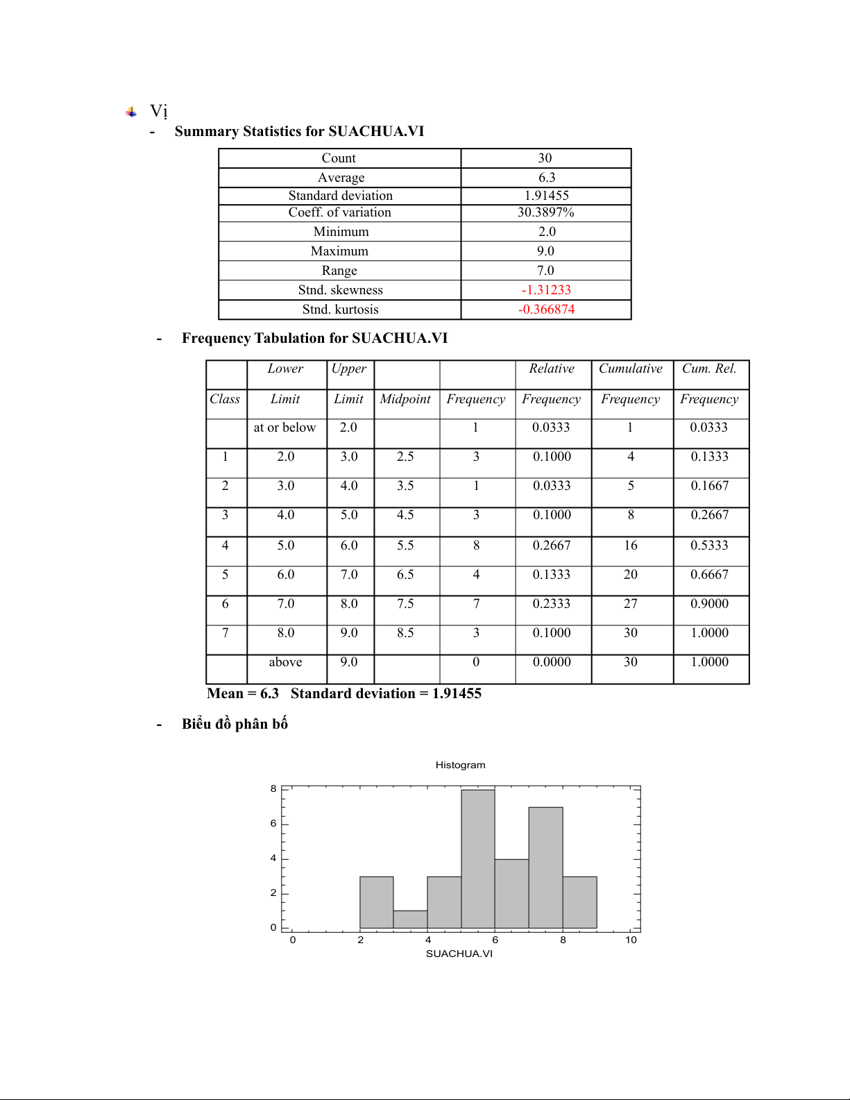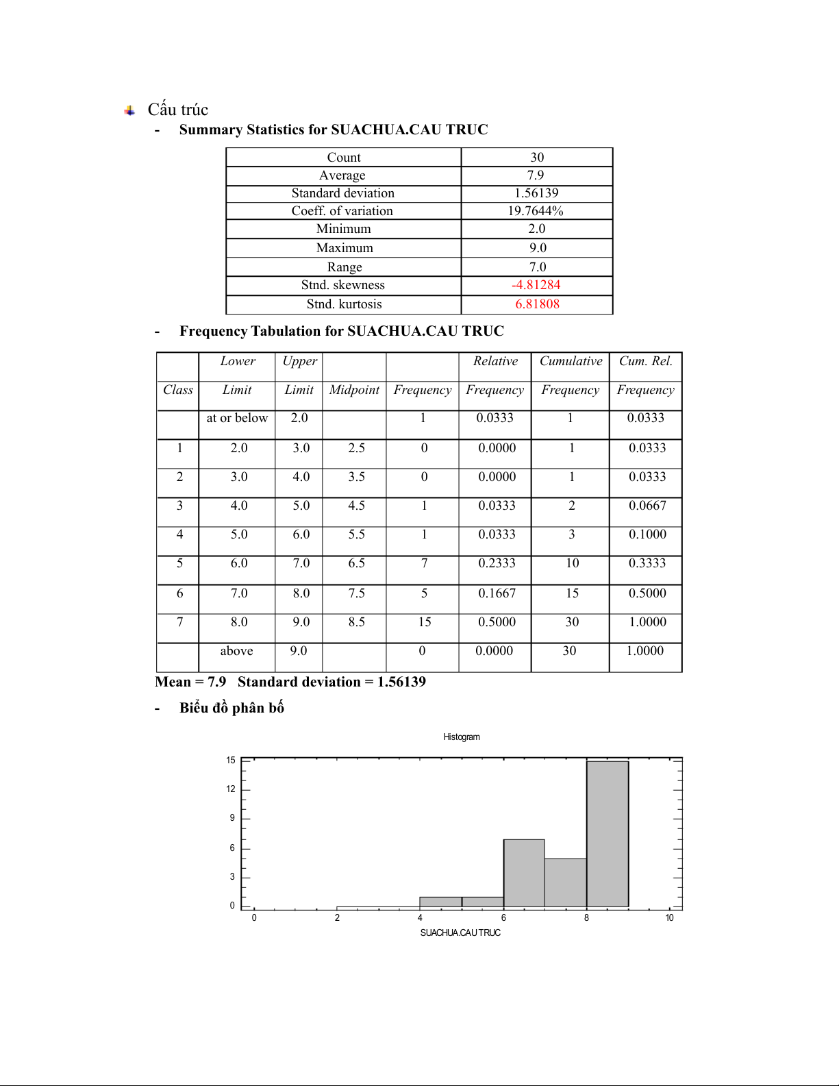 Summary Statistics for SUACHUA.CAU TRUC Count 30 Average 7.9 Standard deviation 1.56139 Coeff. of variation 19.7644% Minimum 2.0 Maximum 9.0 Range 7.0 Stnd. skewness -4.81284 Stnd. kurtosis 6.81808 -