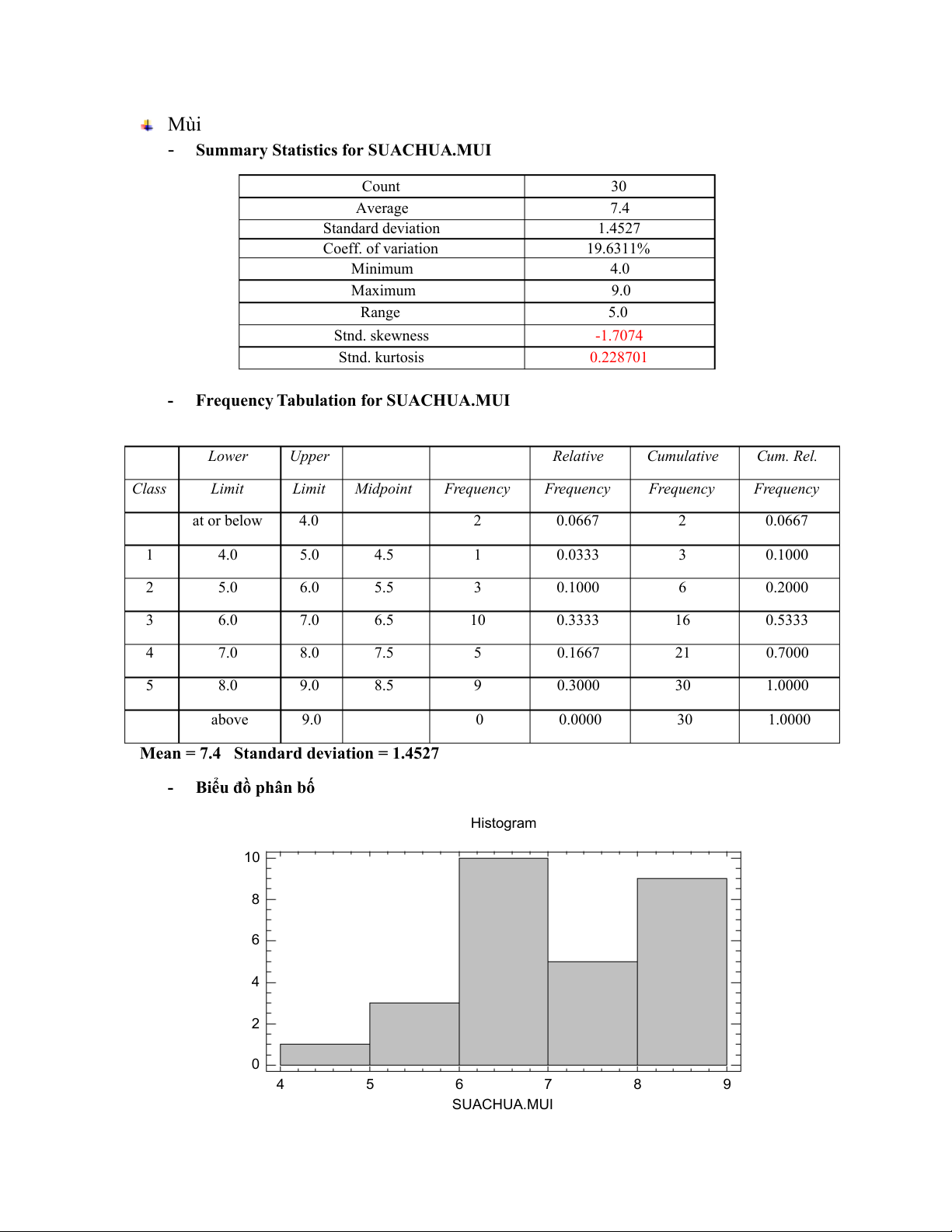 Mean = 7.4 Standard deviation = 1.4527 - Biểu đồ phân bố Histogram 10 8 y c 6 n e u q 4 fre 2 0 4 5 6 7 8 9 SUACHUA.MUI Vị -