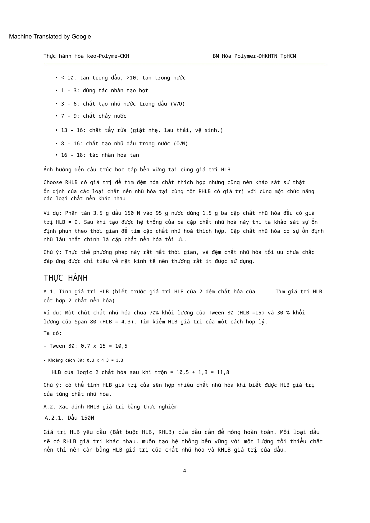 lượng của Span 80 (HLB = 4,3). Tìm kiếm HLB giá trị của một cách hợp lý. Ta có: - Tween 80: 0,7 x 15 = 10,5