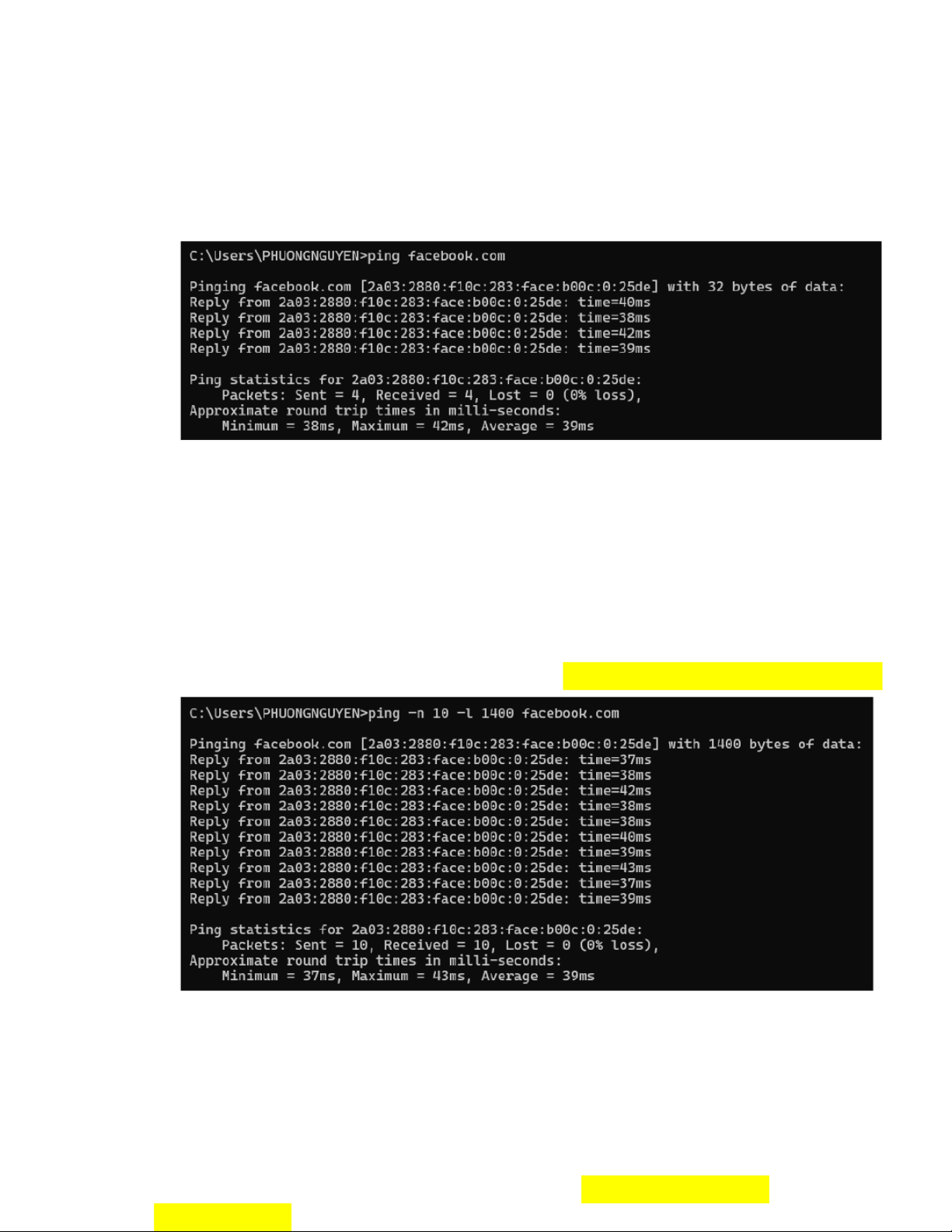 c) Lệnh 3: Gửi 10 gói tin, mỗi gói 1400byte ping -n 10 -l 1400 facebook.com Phân tích kết quả: