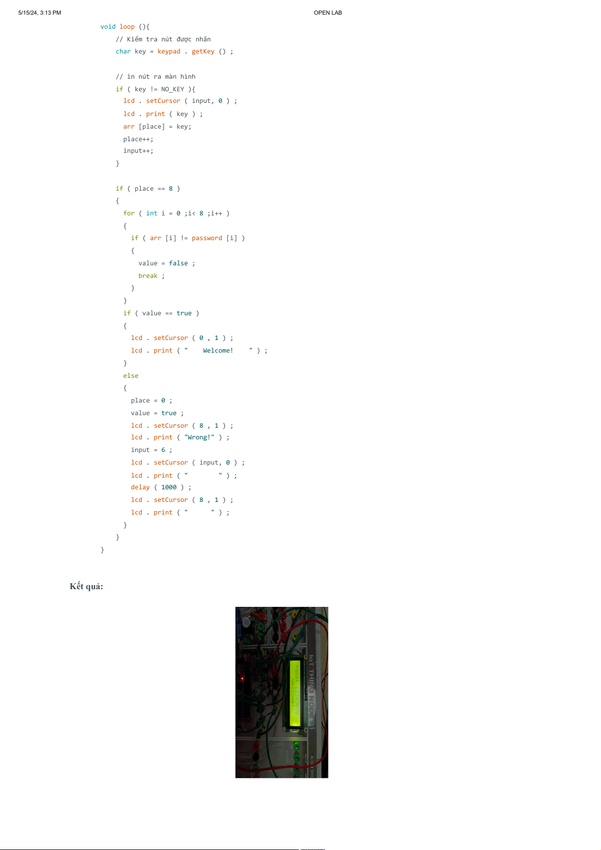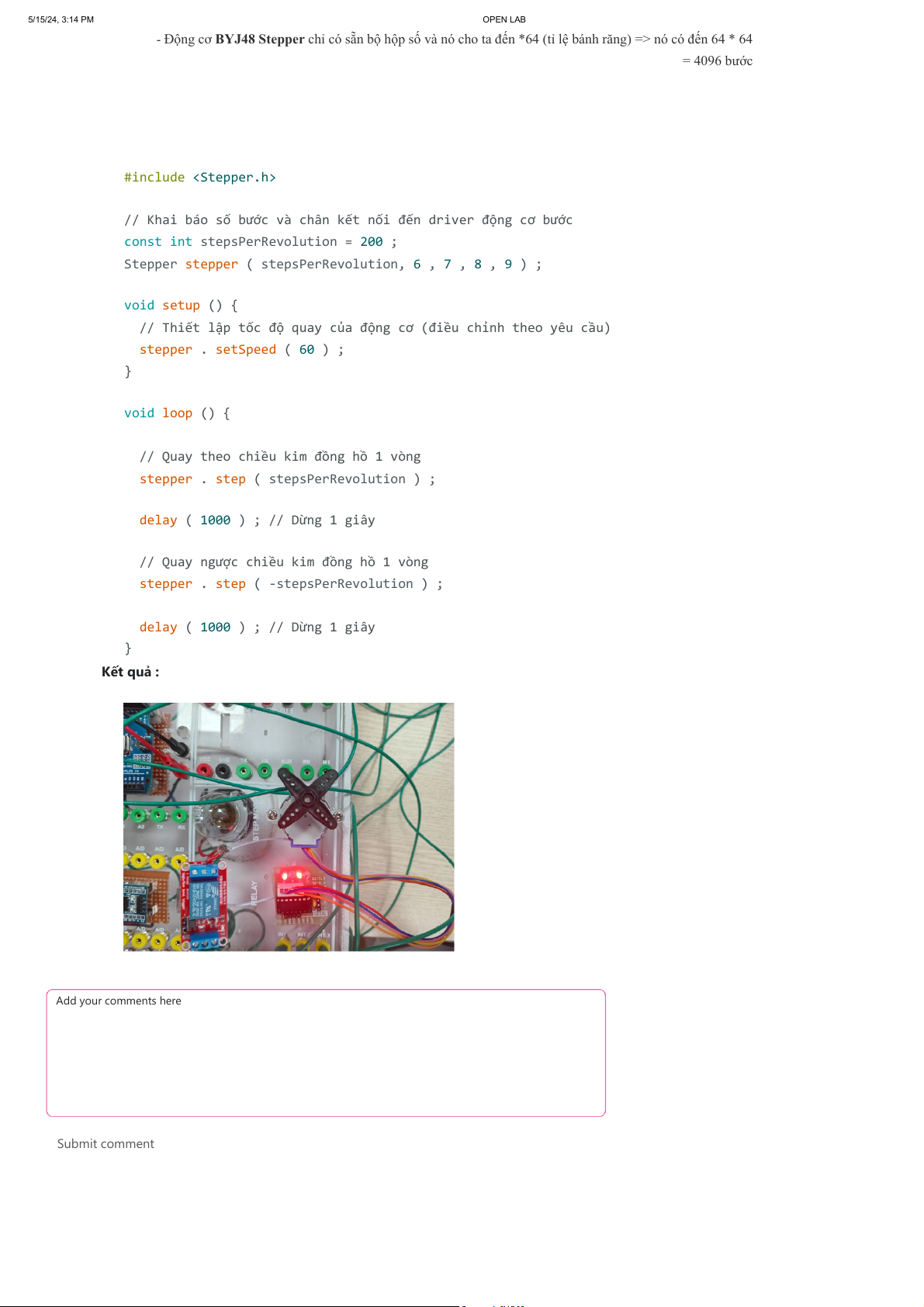 delay ( 1000 ) ; // Dừng 1 giây } Kết quả : Add your comments here Submit comment 5/15/24, 3:14 PM OPEN LAB