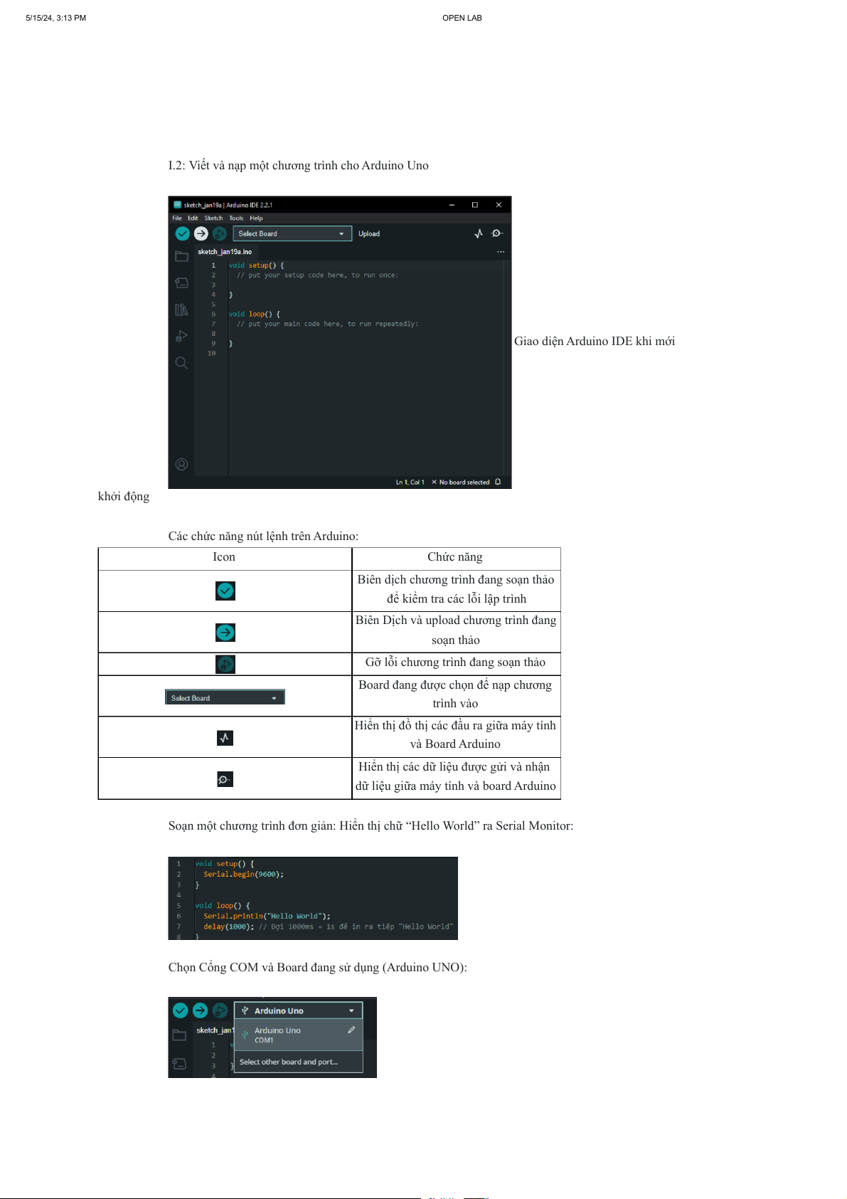 Chọn Cổng COM và Board đang sử dụng (Arduino UNO): 5/15/24, 3:13 PM OPEN LAB