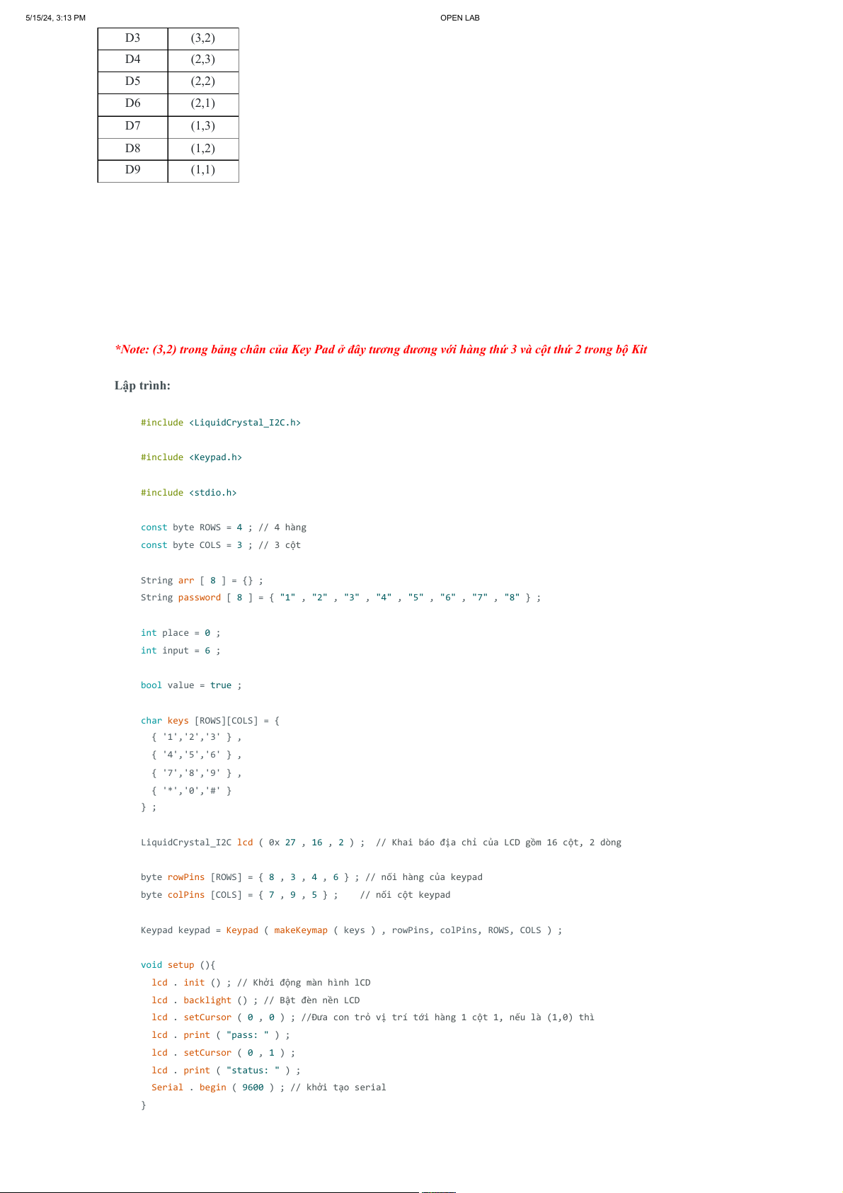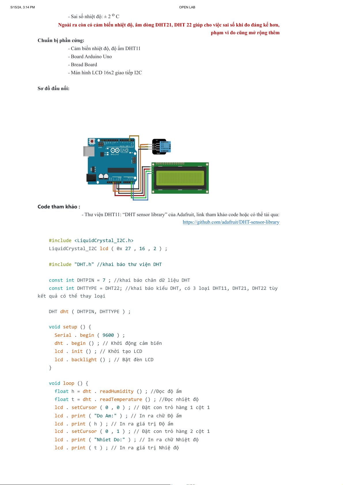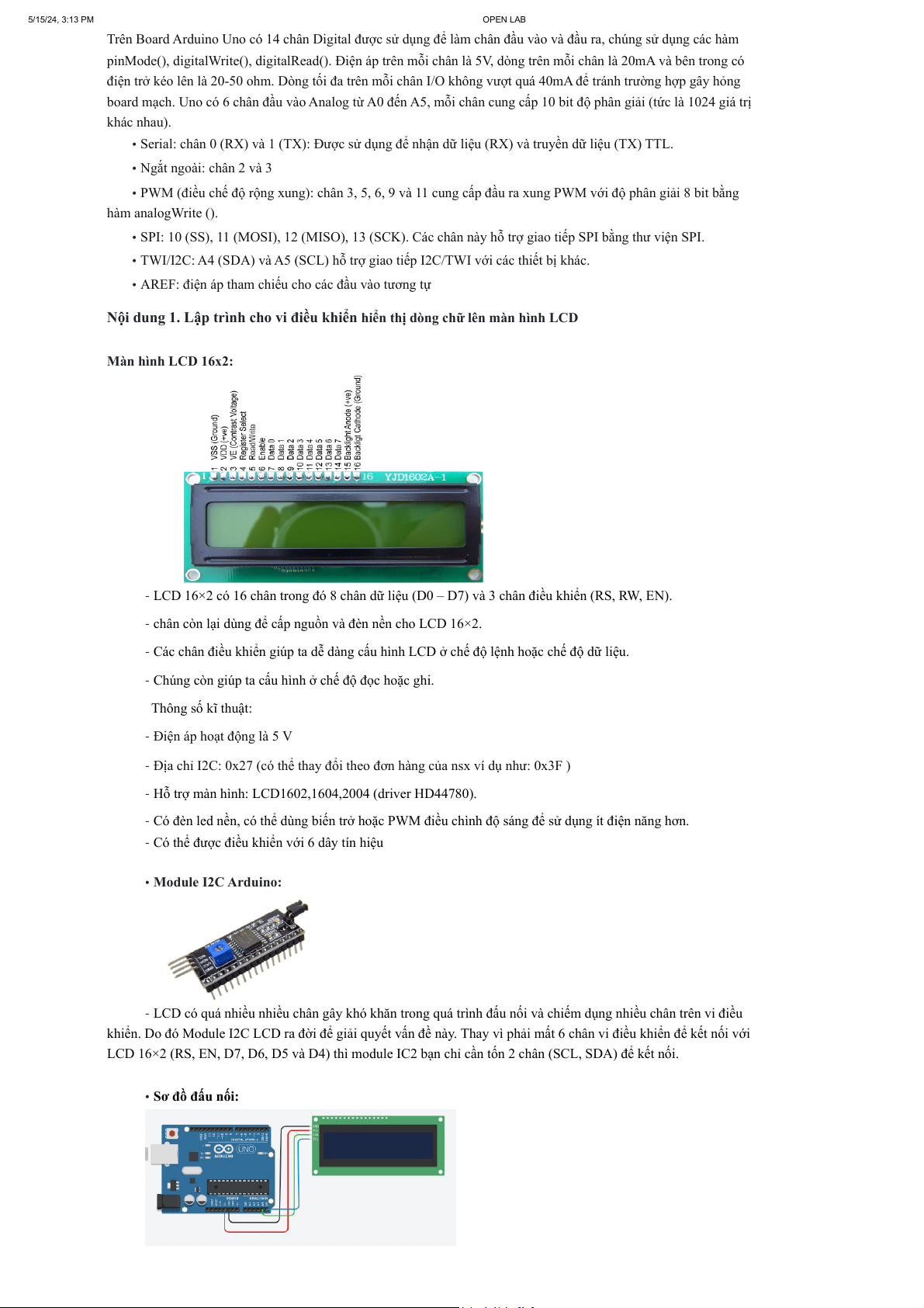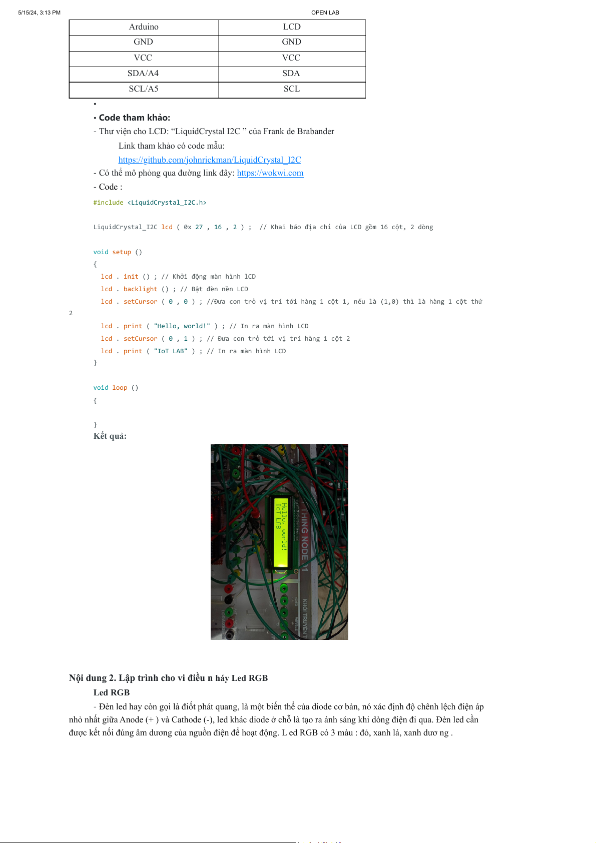 • Sơ đồ đấu nối: 5/15/24, 3:13 PM OPEN LAB Arduino LCD GND GND VCC VCC SDA/A4 SDA SCL/A5 SCL • • Code tham khảo: