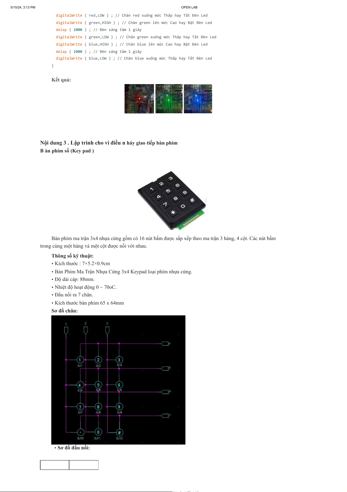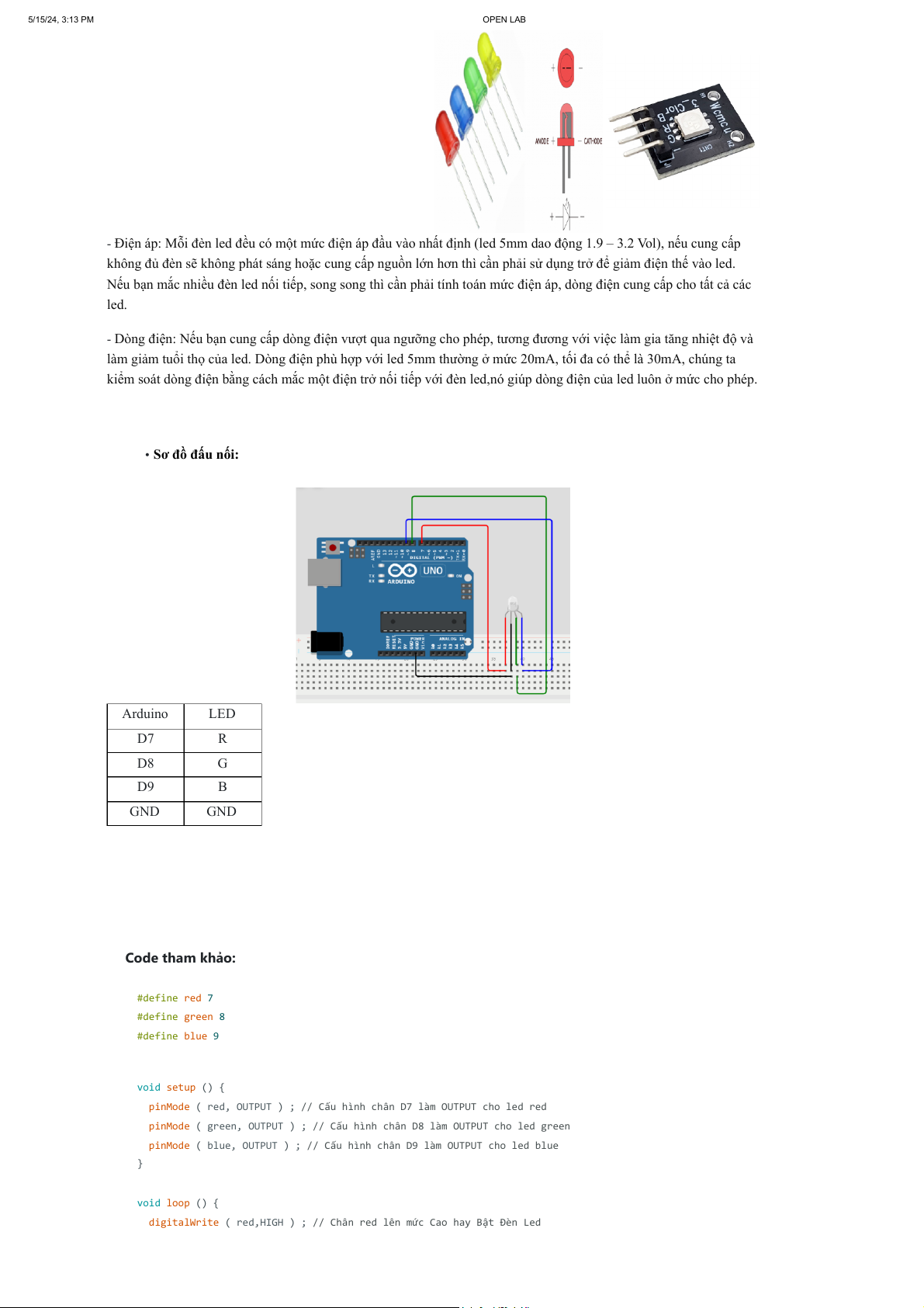 được kết nối đúng âm dương của nguồn điện để hoạt động. L ed RGB có 3 màu : đỏ, xanh lá, xanh dươ ng . 5/15/24, 3:13 PM OPEN LAB