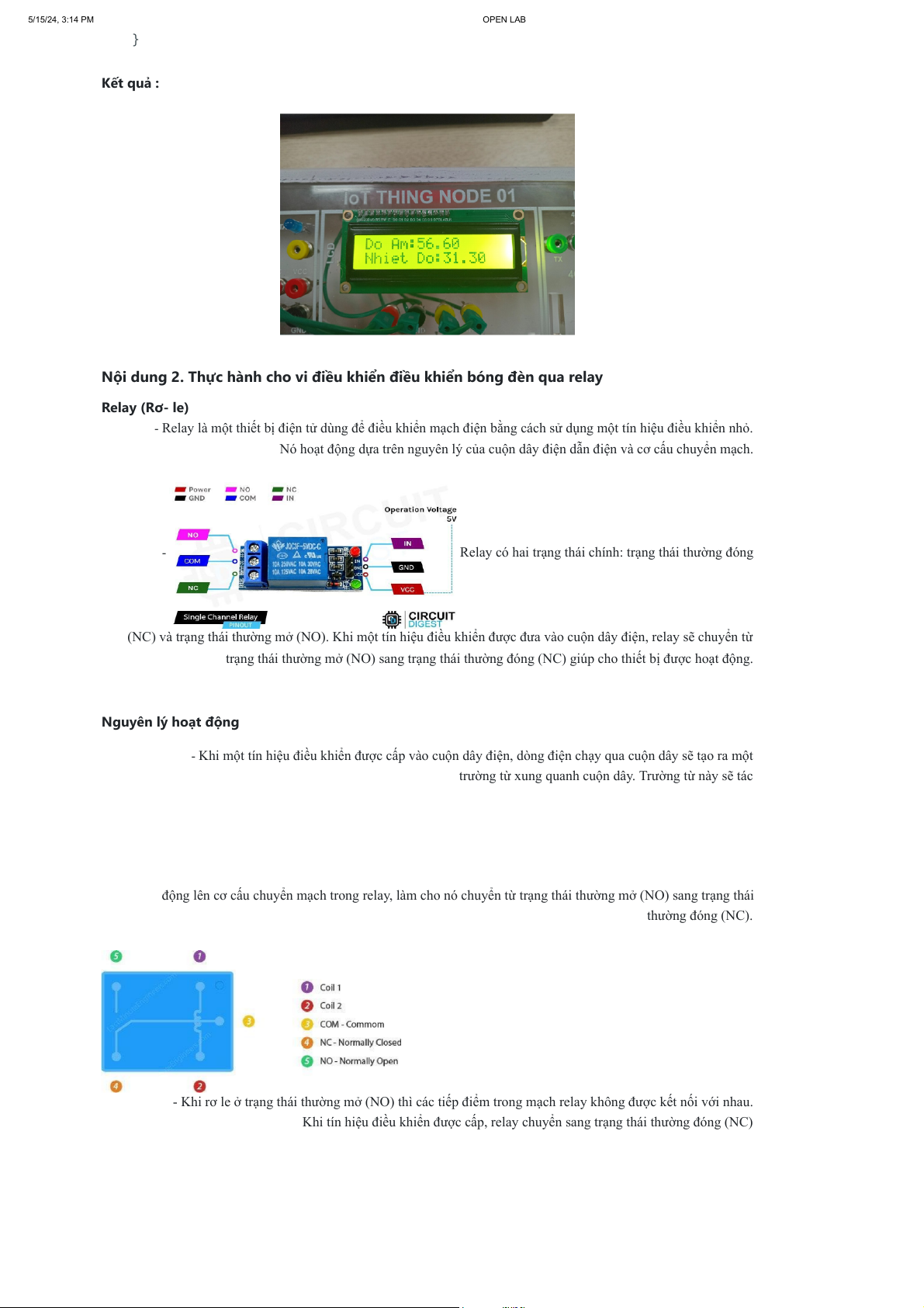 Khi tín hiệu điều khiển được cấp, relay chuyển sang trạng thái thường đóng (NC) 5/15/24, 3:14 PM OPEN LAB