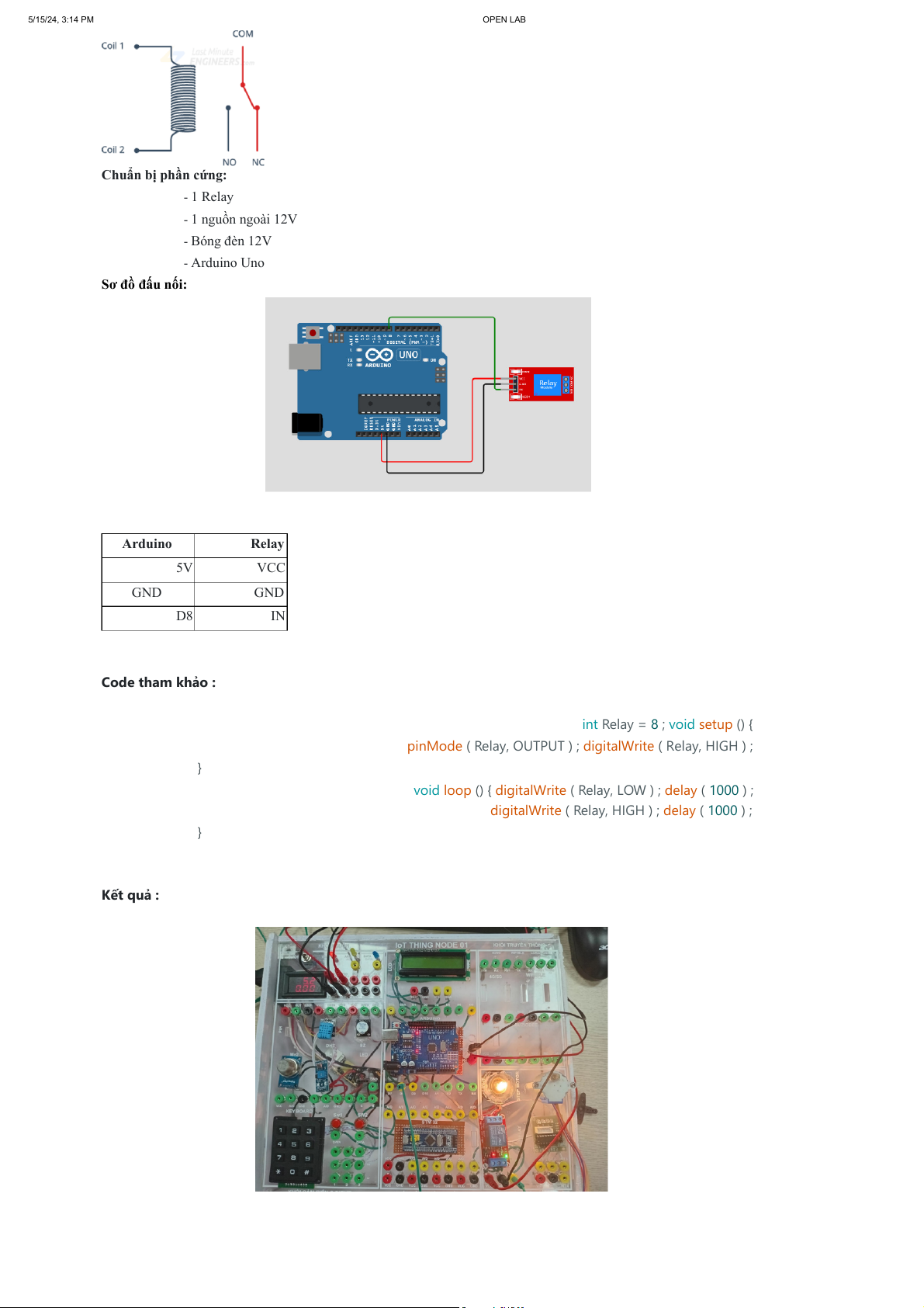 digitalWrite ( Relay, HIGH ) ; delay ( 1000 ) ; } Kết quả : 5/15/24, 3:14 PM OPEN LAB