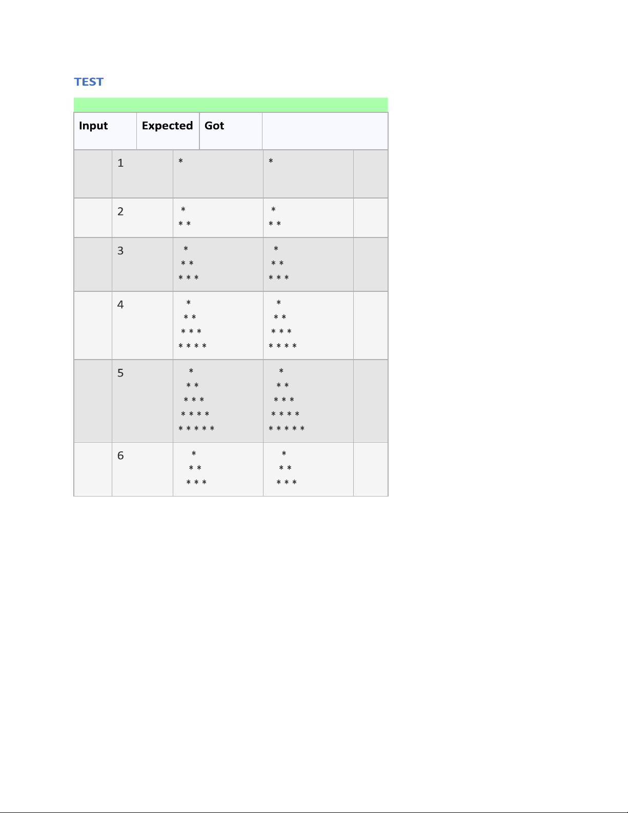 Một số nguyên dương. Vd: 6 Constraints Không có. Output Format Như mô trả trên. n = int(input()) for i in range(1,n + 1): for k in range(1, n-i + 1): print(" ", end="") for j in range(1,i + 1): print("* ", end="") print("") print() lOMoAR cPSD| 58605085 lOMoAR cPSD| 58605085 lOMoAR cPSD| 58605085