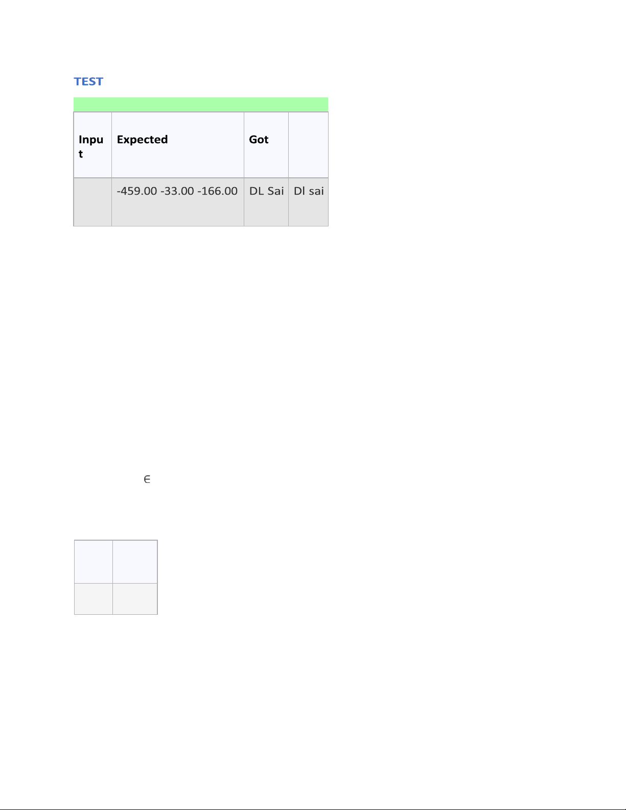a > b: a,b = b,a s = 0 c = 0 lOMoAR cPSD| 58605085 for i in range(a, b+1): if i % 2 == 0: s += i c += 1 re = s/c print("%.2f"%(re)) TEST Inpu Expected Got t 9 1 5.00 5.00