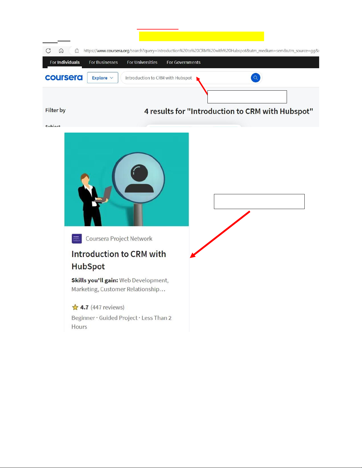 ớ c 2: Tìm ki ế m khóa h ọ c “ Introduction to CRM with Hubspot ” trên Coursera .