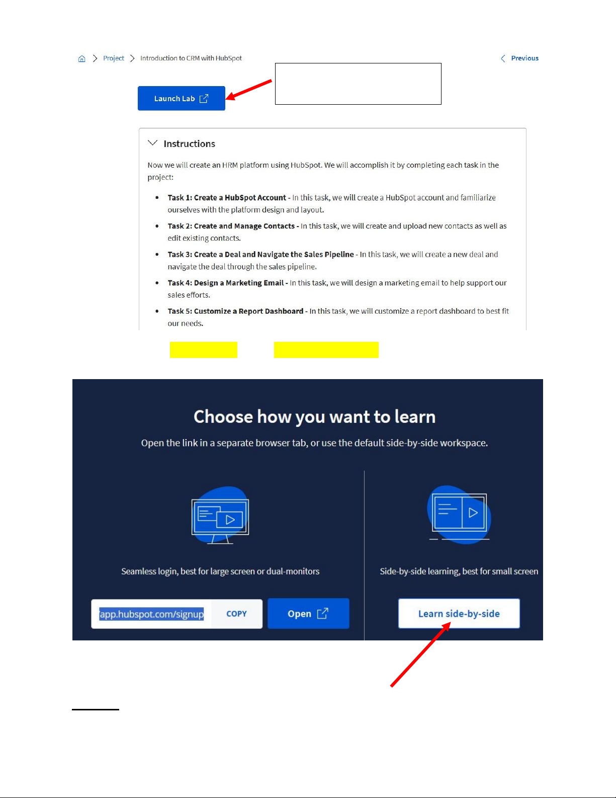 Sau khi click vào Launch Lab, chọn Learn side-by-side để xem hướng dẫn trên video của Lab: