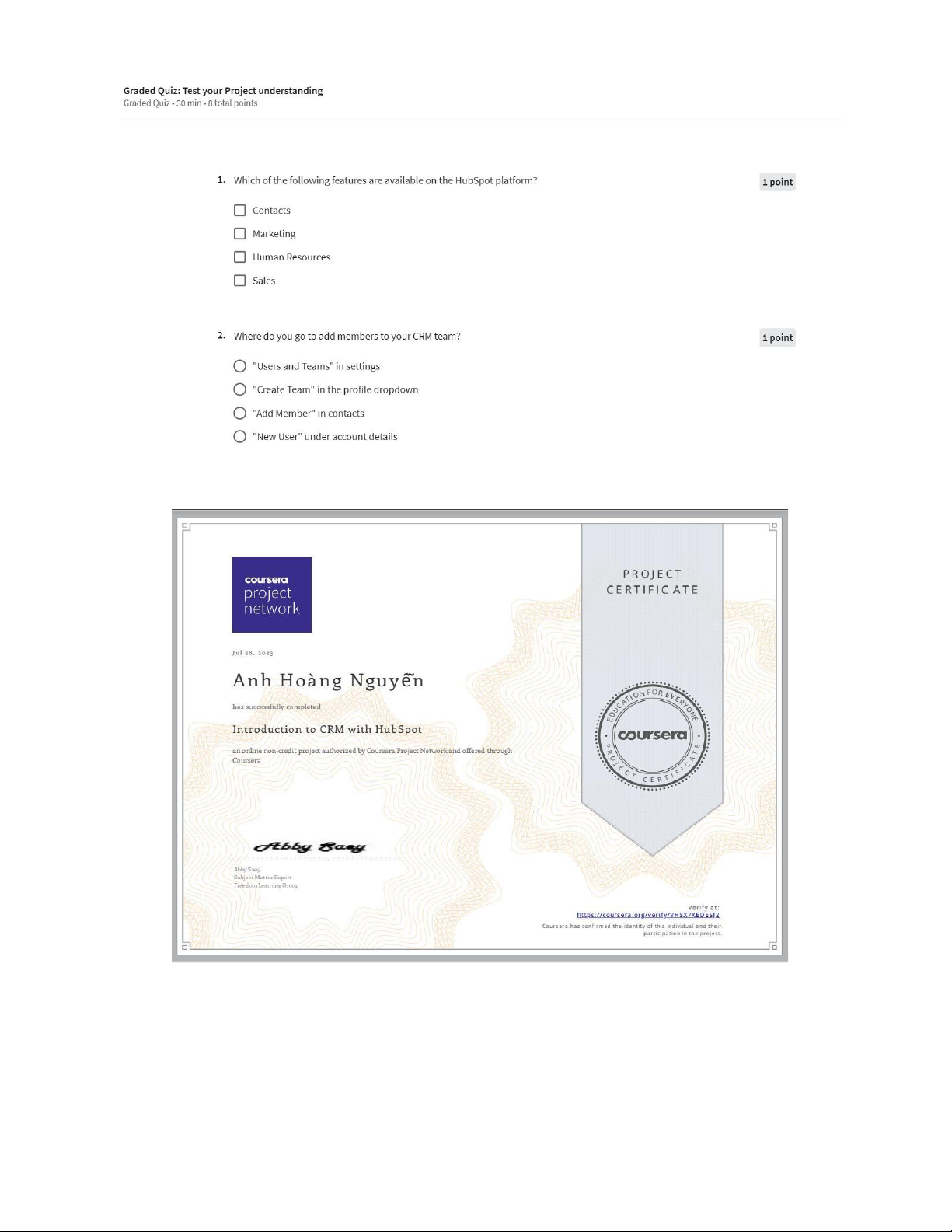 Chú ý: các em lưu lại CERTIFICATE này để nộp lại cho Cô, nếu không có hoặc