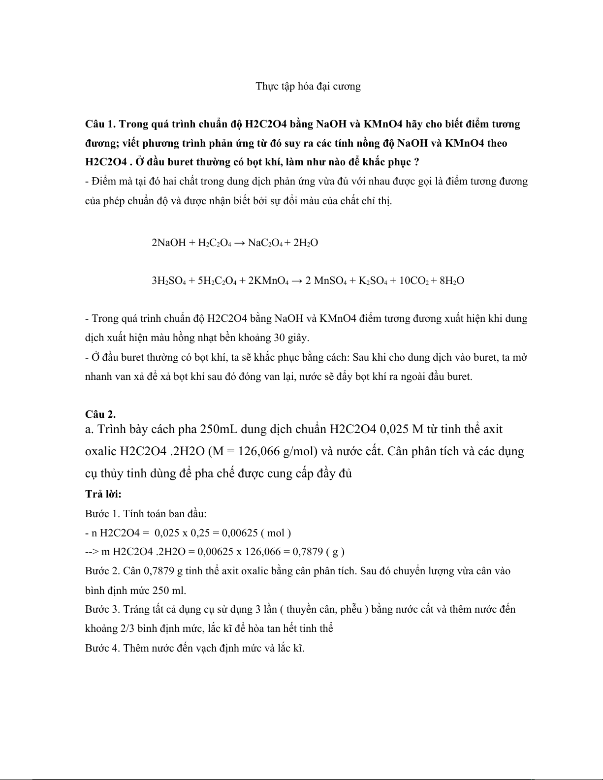 Câu 1. Trong quá trình chuẩn độ H2C2O4 bằng NaOH và KMnO4 hãy cho biết điểm tương
