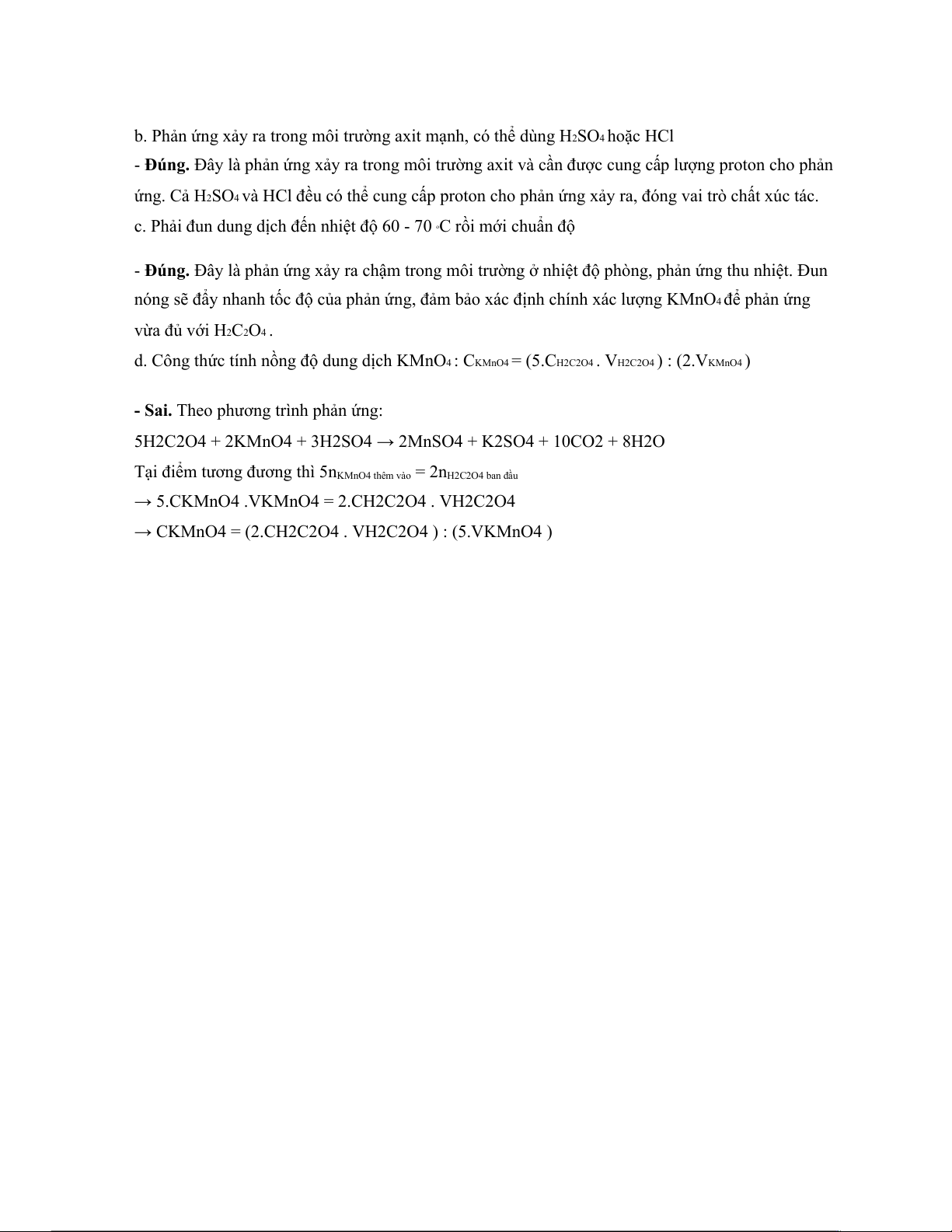 của phép chuẩn độ và được nhận biết bởi sự đổi màu của chất chỉ thị. 2NaOH + H2C O 2 4 NaC → 2O + 2H 4 O 2 3H SO 2 4 + 5H C 2 2O4 + 2KMnO 4 → 2 MnSO + K 4 SO 2 4 + 10CO + 8H 2 O 2