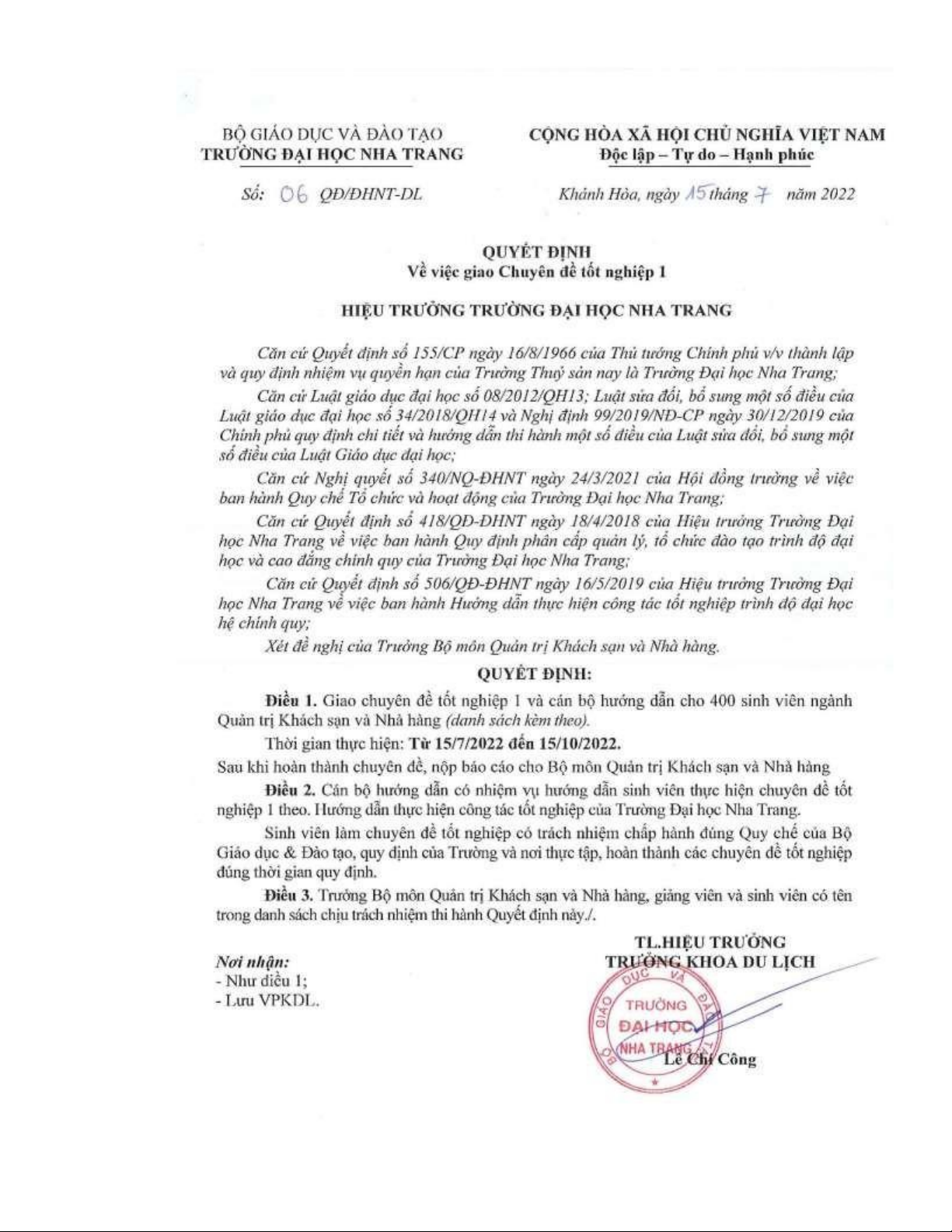 oan chịu hoàn toàn trách nghiệm về bài báo cáo này. Trường ại học Nha Trang không liên