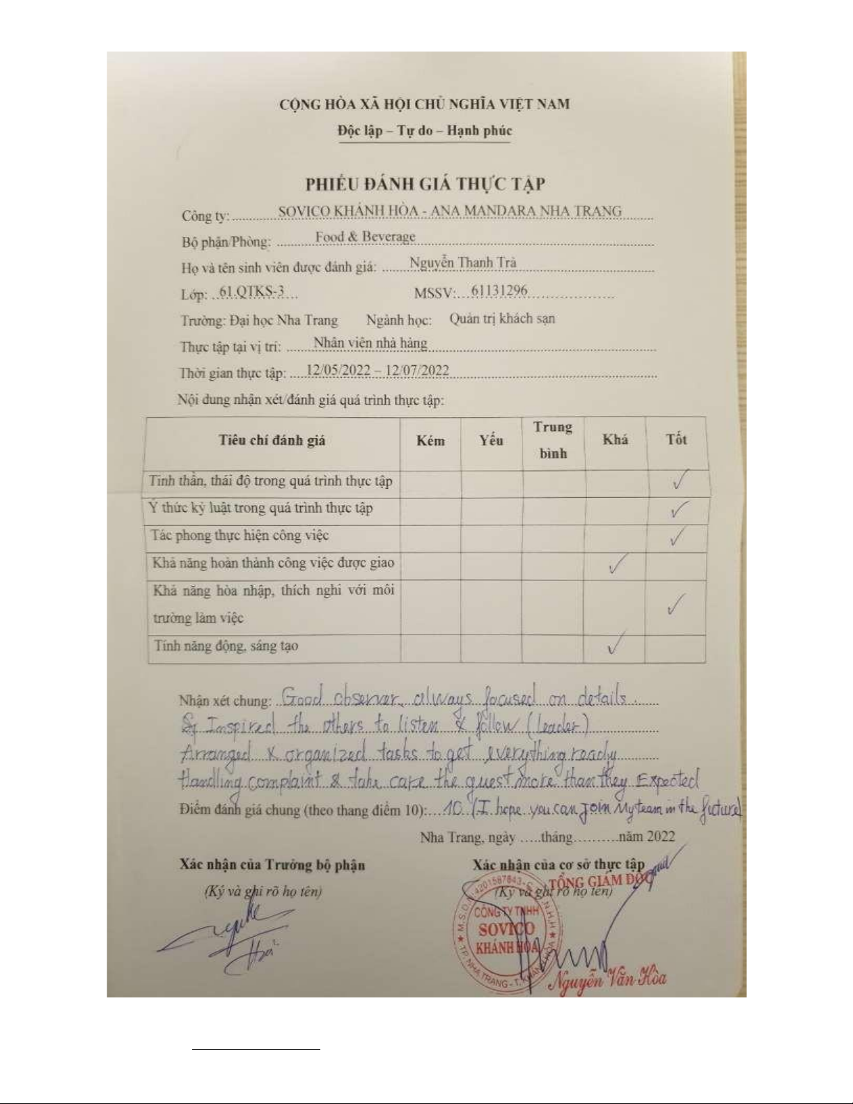 Tên ề tài: Thực tập nghề nghiệp vị trí F&B tại Ana Mandara Nha Trang Resort