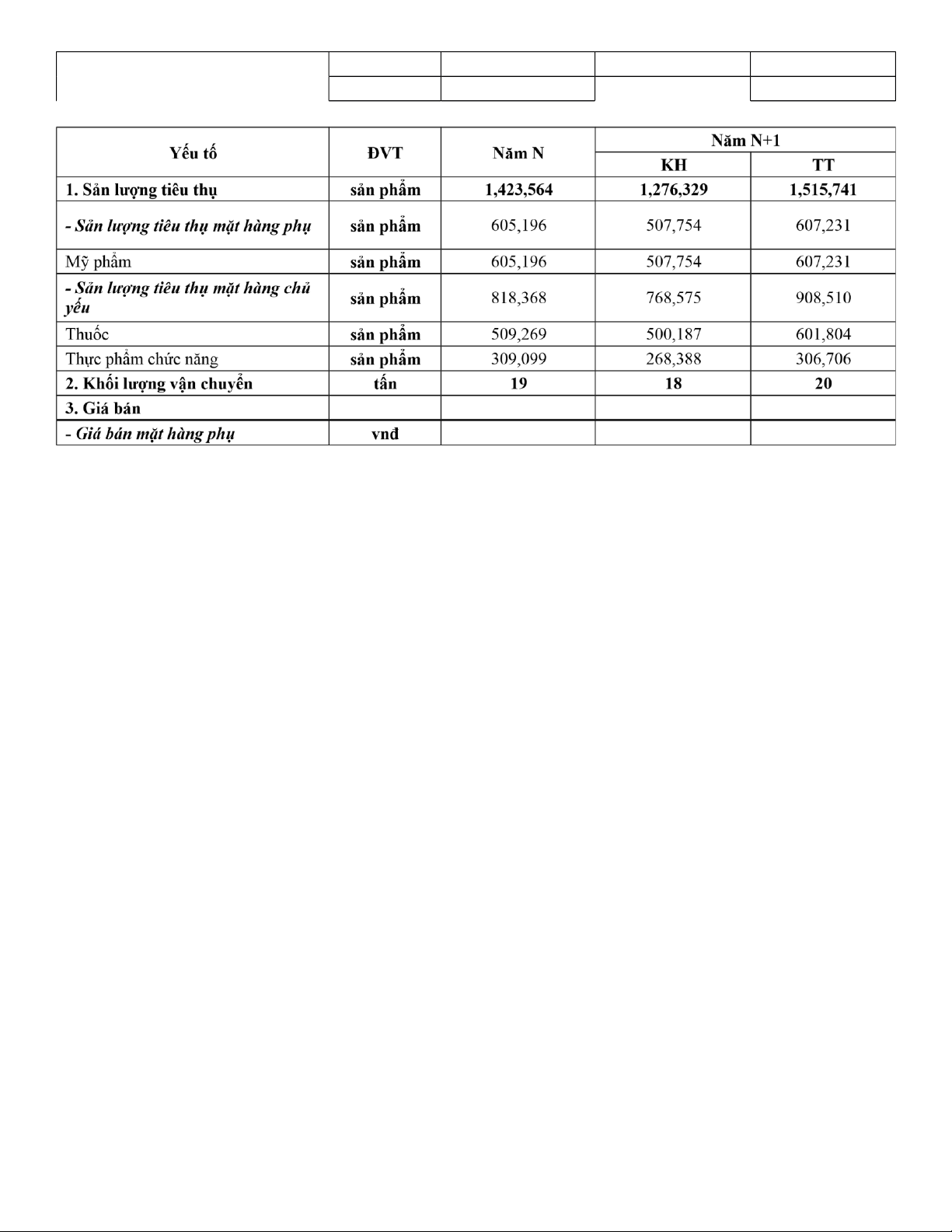 Bảng 3: Tình hình kết quả kinh doanh của doanh nghiệp thương mại năm 2019-2020 Năm N+1 Yếu tố ĐVT Năm N KH TT